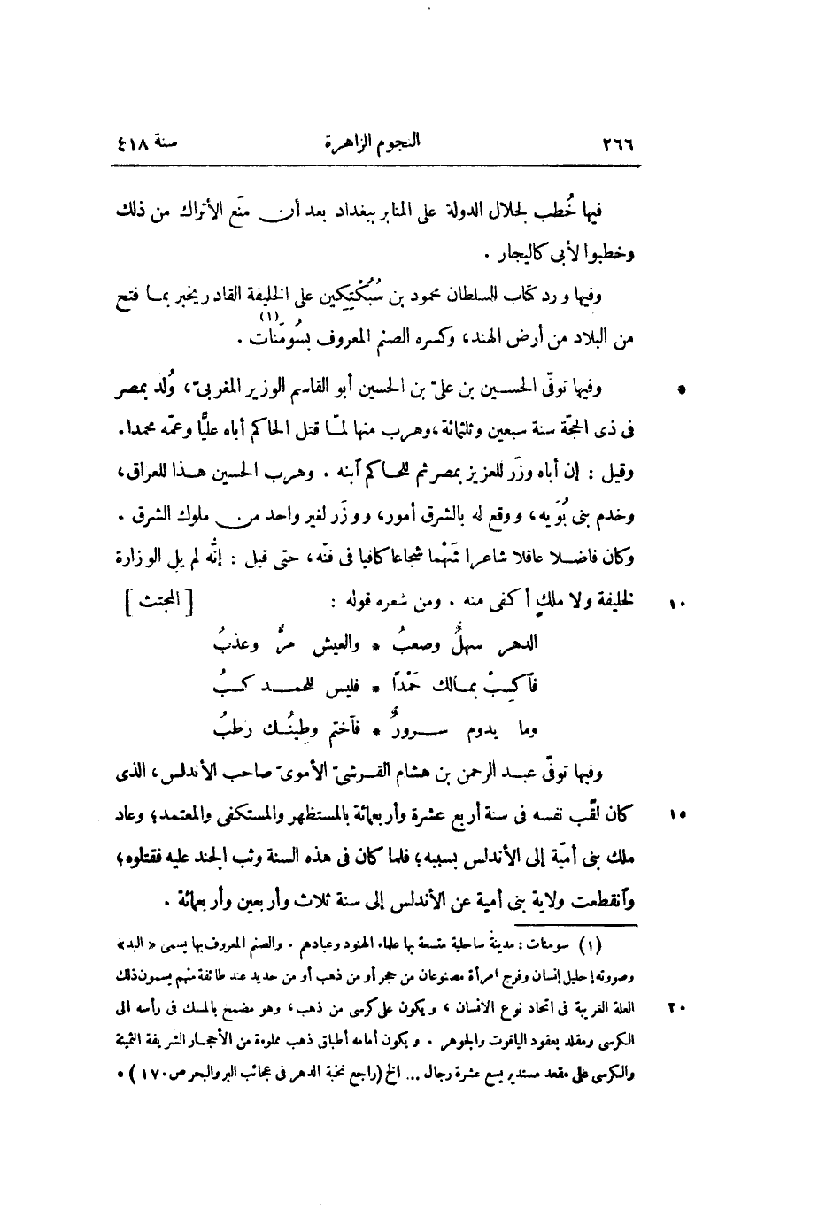 وفيها ورد كتاب للسلطان محمود بن سبكتكين على الخليفة القادر يخبر بما فتح من البلاد من أرض الهند، وكسره الصنم المعروف بسومنات «1» .