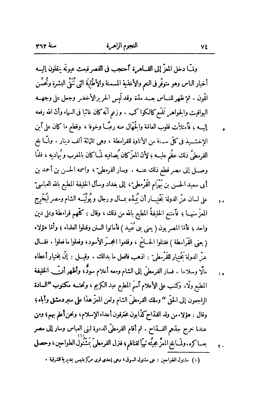ولمّا دخل المعزّ إلى القاهرة احتجب في القصر فبعث عيونه ينقلون إليه أخبار الناس وهو متوفّر في النعم والأغذية المسمنة والأطلية التى تنقّى البشرة وتحسّن اللّون. ثمّ ظهر للناس بعد مدّة وقد لبس الحرير الأخضر وجعل على وجهه اليواقيت والجواهر تلمع كالكواكب. وزعم أنّه كان غائبا في السماء وأنّ الله رفعه إليه؛ فامتلأت قلوب العامّة والجهّال منه رعبا وخوفا، وقطع ما كان على ابن الإخشيذ في كلّ سنة من الأتاوة للقرامطة، وهى ثلثمائة ألف دينار. ولمّا بلغ القرمطىّ ذلك عظم عليه؛ لأنّ المعزّ كان يصافيه لمّا كان بالمغرب ويهاديه، فلمّا وصل إلى مصر قطع ذلك عنه. وسار القرمطىّ، واسمه الحسن بن أحمد بن أبى سعيد الحسن بن بهرام القرمطىّ، إلى بغداد وسأل الخليفة المطيع بالله العباسىّ على لسان عزّ الدولة بختيار أن يمدّه بمال ورجال ويولّيه الشام ومصر ليخرج المعزّ منها؛ فامتنع الخليفة المطيع بالله من ذلك، وقال: كلّهم قرامطة وعلى دين واحد؛ فأمّا المصريون (يعنى بنى عبيد) فأماتوا السنن وقتلوا العلماء؛ وأمّا هؤلاء (يعنى القرامطة) فقتلوا الحاجّ، وقلعوا الحجر الأسود، وفعلوا ما فعلوا. فقال عزّ الدولة بختيار للقرمطىّ: اذهب فافعل ما بدالك. وقيل: إنّ بختيار أعطاه مالا وسلاحا. فسار القرمطىّ إلى الشام ومعه أعلام سود، وأظهر أنّ الخليفة المطيع ولّاه وكتب على الأعلام اسم المطيع عبد الكريم، وتحته مكتوب" السادة الراجعون إلى الحقّ" وملك القرمطىّ الشام ولعن المعزّ هذا على منبر دمشق وأباه؛ وقال: هؤلاء من ولد القدّاح كذّابون مخترقون أعداء الإسلام، ونحن أعلم بهم؛ ومن عندنا خرج جدّهم القدّاح. ثم أقام القرمطىّ الدعوة لبنى العباس وسار إلى مصر بعساكره. ولمّا بلغ المعزّ مجيئه تهيّأ لقتالهم؛ فنزل القرمطىّ بمشتول «1» الطواحين، وحصل