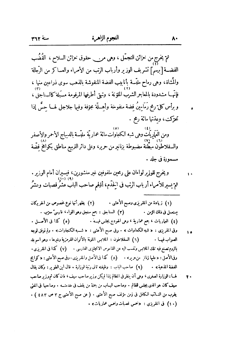 ومن العماريّات «4» وهى شبه الكجاوات «5» مائة عماريّة ملبّسة بالديباج الأحمر والأصفر والسقلاطون «6» مبطّنة «7» مضبوطة بزنانير من حرير، وعلى دائر التربيع مناطق بكوامخ «8» فضّة مسمورة في جلد.