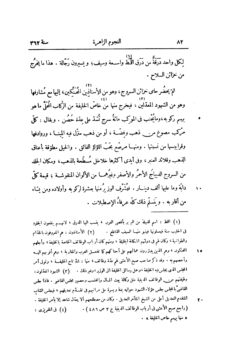 ثمّ يحضر حامى خزائن السروج، وهو من الأستاذين «2» المحنّكين، إليها مع مشارفها وهو من الشهود المعدّلين «3» ، فيخرج منها من «4» خاصّ الخليفة من الرّكاب المحلّى ما هو برسم ركوبه، وما يجنب في الموكب مائة سرج تشدّ على عدّة حصن. ويقال: كلّ مركب مصوغ من ذهب وفضّة، أو من ذهب منزّل فيه المينا، وروادفها وقرابيسها من نسبتها. ومنها مرصّع بحبّ اللؤلؤ الفائق. والخيل مطوّقة بأعناق الذهب وقلائد العنبر، وفي أيدى أكثرها خلاخل مسطّحة بالذهب، ومكان الجلد من السروج الديباج الأحمر والأصفر وغيرهما من الألوان المنقوشة؛ قيمة كلّ دابّة وما عليها ألف دينار. فيشرّف الوزير منها بعشرة لركوبه وأولاده ومن يشاء من أقاربه. ويتسلّم ذلك كلّه عرفاء الإصطبلات.