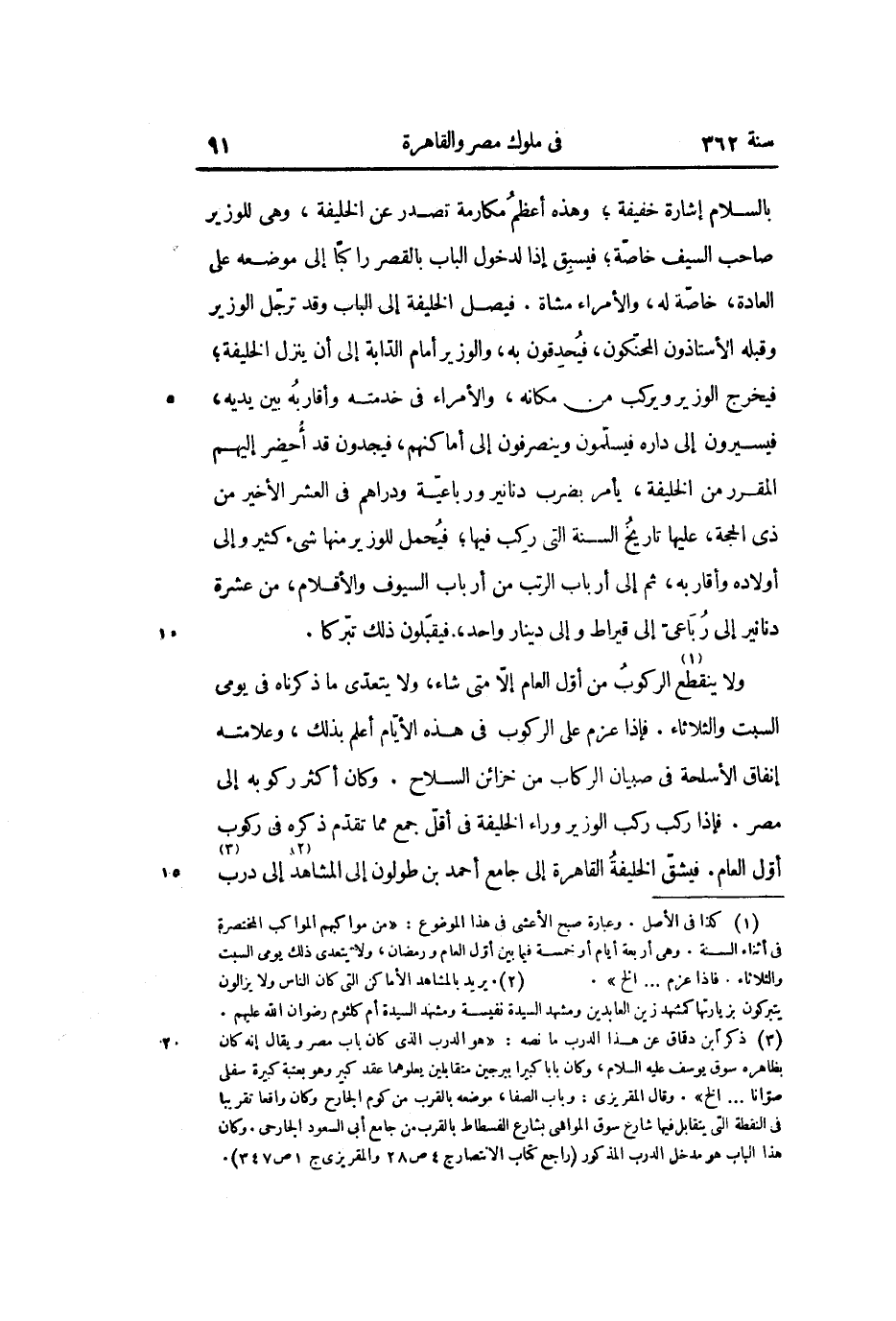 بالسلام إشارة خفيفة؛ وهذه أعظم مكارمة تصدر عن الخليفة، وهى للوزير صاحب السيف خاصّة؛ فيسبق إذا لدخول الباب بالقصر راكبا إلى موضعه على العادة، خاصّة له، والأمراء مشاة. فيصل الخليفة إلى الباب وقد ترجّل الوزير وقبله الأستاذون المحنّكون، فيحدقون به، والوزير أمام الدّابة إلى أن ينزل الخليفة؛ فيخرج الوزير ويركب من مكانه، والأمراء في خدمته وأقاربه بين يديه، فيسيرون إلى داره فيسلّمون وينصرفون إلى أماكنهم، فيجدون قد أحضر إليهم المقرر من الخليفة، يأمر بضرب دنانير ورباعيّة ودراهم في العشر الأخير من ذى الحجة، عليها تاريخ السنة التى ركب فيها؛ فيحمل للوزير منها شىء كثير وإلى أولاده وأقاربه، ثم إلى أرباب الرتب من أرباب السيوف والأقلام، من عشرة دنانير إلى رباعىّ إلى قيراط وإلى دينار واحد، فيقبلون ذلك تبرّكا.