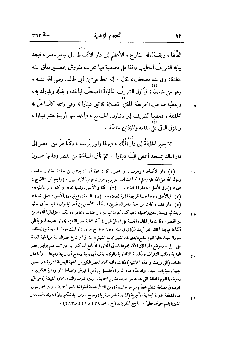 الصّفا، ويقال له الشارع، الأعظم إلى دار الأنماط «1» إلى جامع مصر، فيجد ببابه الشريف الخطيب واقفا على مصطبة فيها محراب مفروش بحصير معلّق عليه سجادة، وفي يده مصحف، يقال: إنه بخط علىّ بن أبى طالب رضى الله عنه، وهو من خاصله «2» ، فيناول الشريف الخليفة المصحف فيأخذه ويقبّله ويتبارك به، ويعطيه صاحب الخريطة المقرّر «3» للصلاة ثلاثين دينارا، وهى رسمه كلّما مرّ به الخليفة، فيعطيها الشريف إلى مشارف الجامع، فيأخذ منها أربعة عشر دينارا، ويفرّق الباقى على «4» القامة والمؤذنين خاصّة.