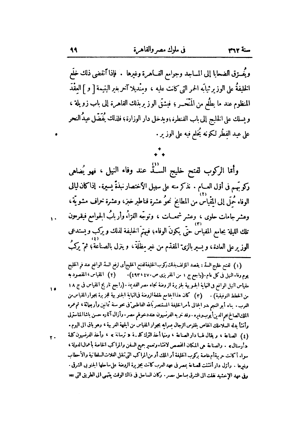 *** وأمّا الركوب لفتح خليج السدّ «1» عند وفاء النيل، فهو يضاهى ركوبّهم في أوّل العام. نذكر منه على سبيل الاختصار نبذة يسيرة. إذا كان ليالى الوفاء حمل إلى المقياس «2» من المطابخ نحو عشرة قناطير خبز، وعشرة خراف مشويّة، وعشر جامات حلوى، وعشر شمعات، وتوجّه القرّاء وأرباب الجوامع فيقرءون تلك الليلة بجامع المقياس «3» حتّى يكون الوفاء؛ فيهتم الخليفة لذلك ويركب ويستدعى الوزير على العادة، ويسير بالزىّ المقدّم من غير مظلّة، وينزل بالصناعة «4» ؛ ثمّ يركب