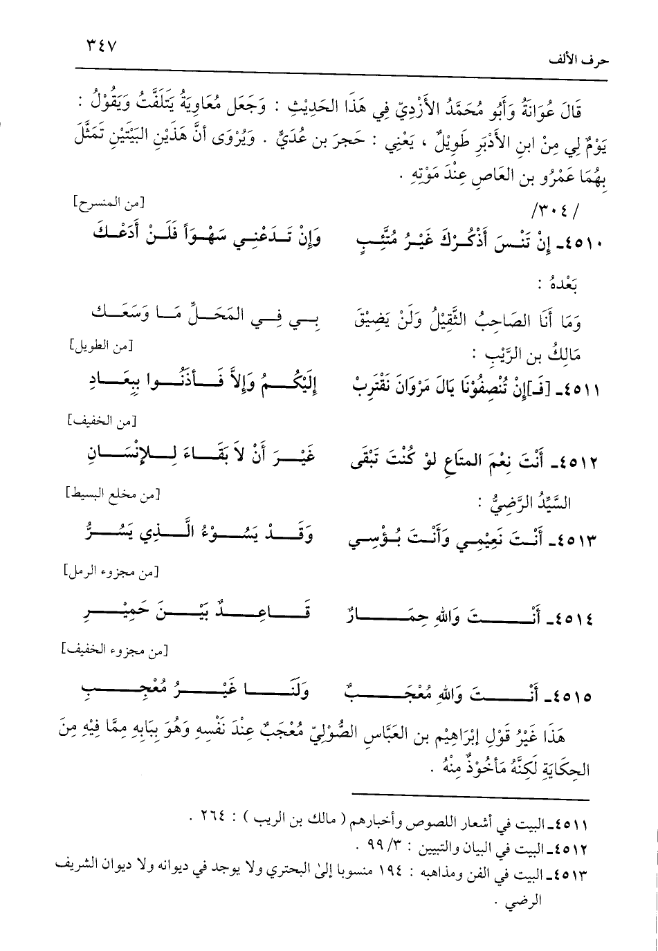 4513 - البيت في الفن ومذاهبه: 194 منسوبا إلى البحتري ولا يوجد في ديوانه ولا ديوان الشريف الرضي.