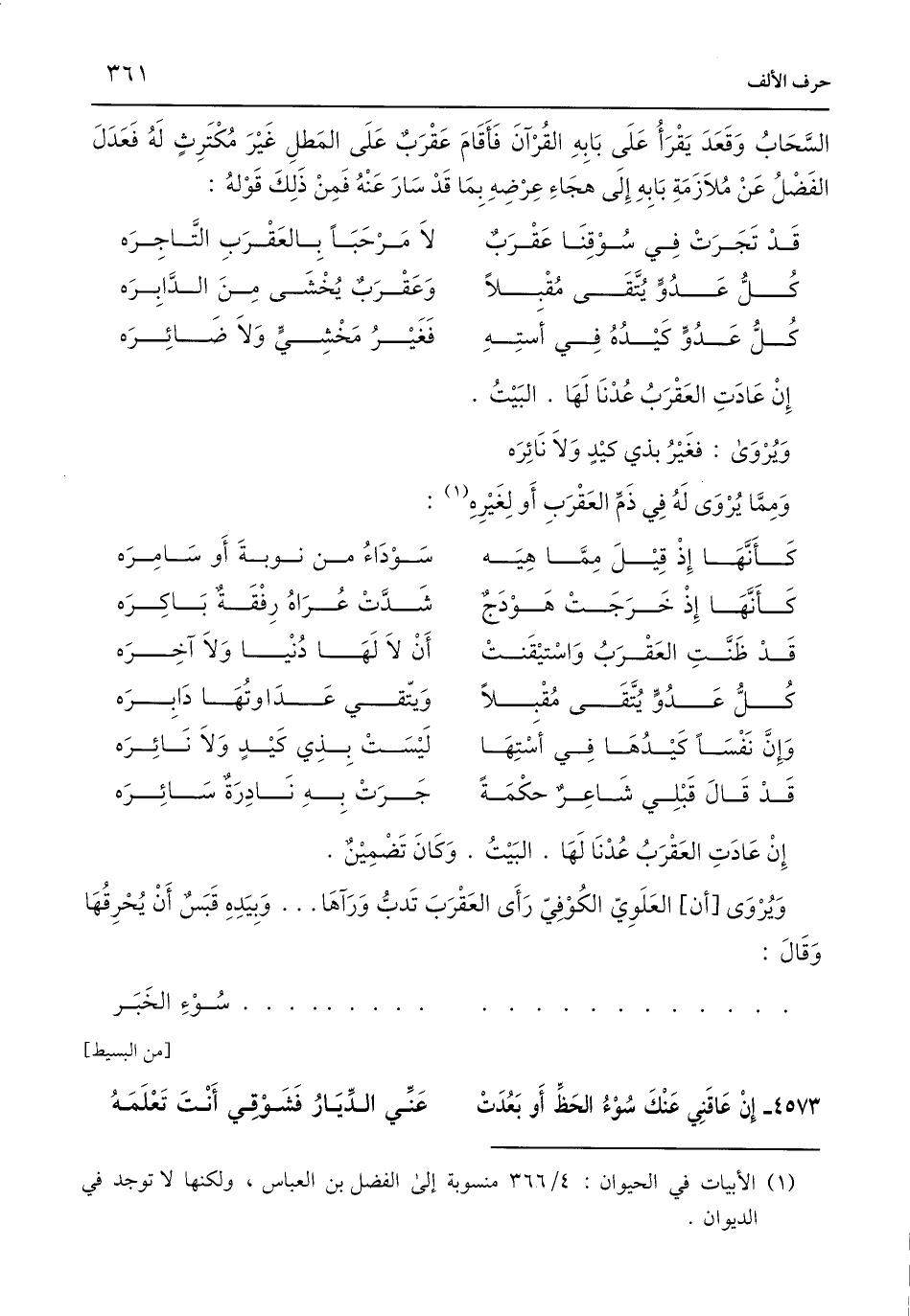وَيُرْوَى [أن] العَلَوِيّ الكُوْفِيّ رَأَى العَقْرَبَ تَدبُّ وَرَآهَا. . . وَبِيَدِهِ قَبَسٌ أَنْ يُحْرِقُهَا وَقَالَ: