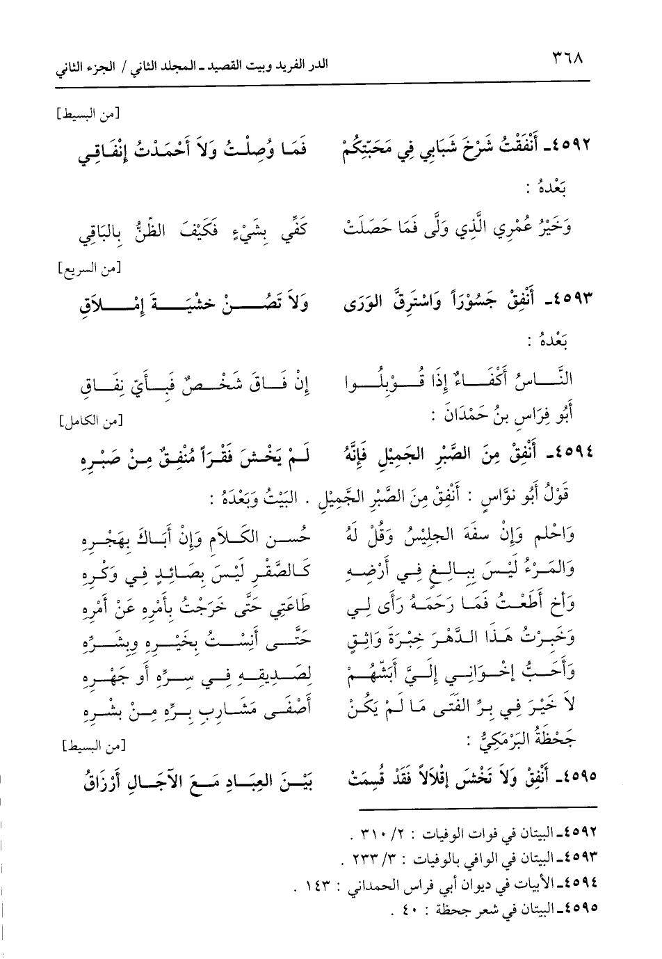 4592 - أَنْفَقْتُ شَرْخَ شَبَابِي فِي مَحَبّتِكُمْ ... فَمَا وُصِلْتُ وَلَا أَحْمَدْتُ إنْفَاقِي