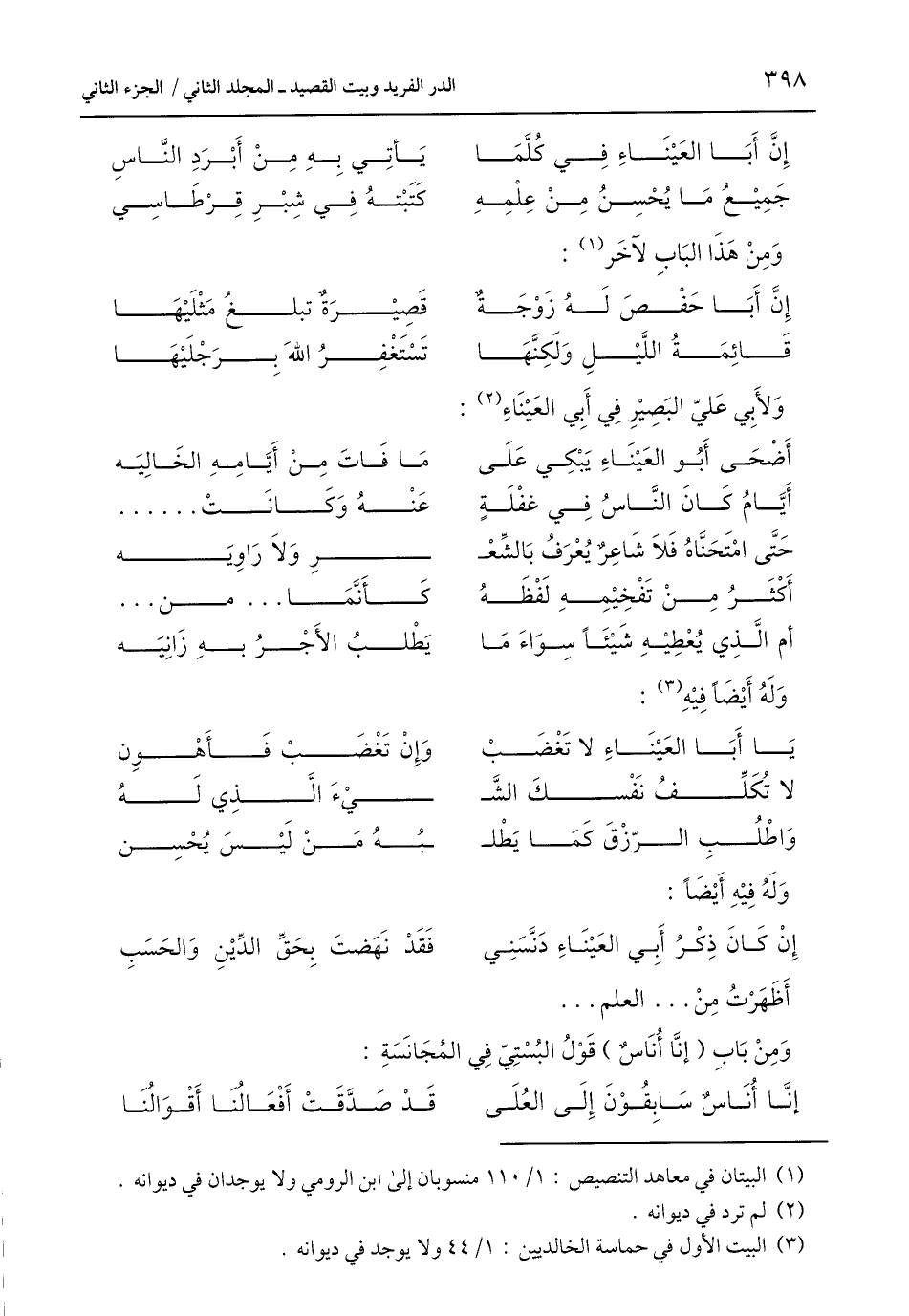 إِنْ كَانَ ذِكْرُ أَبِي العَيْنَاءِ دَنَّسَنِي ... فَقَدْ نَهَضتَ بِحَقِّ الدِّيْنِ وَالحَسَبِ