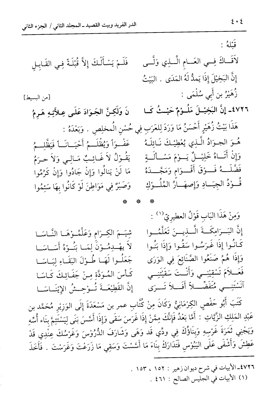4726 - إِنَّ البَخِيْلَ مَلُوْمٌ حَيْثُ كَا ... نَ وَلَكِنَّ الجَوَادَ عَلَى عِلَّاتِهِ هَرِمُ
