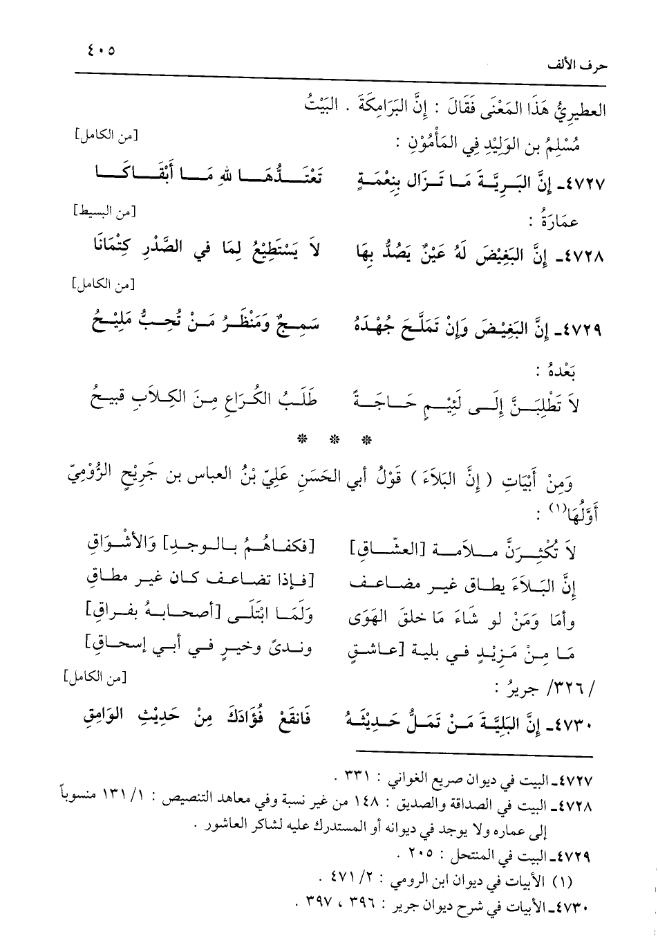 4728 - البيت في الصداقة والصديق: 148 من غير نسبة وفي معاهد التنصيص: 1/ 131 منسوبًا إلى عماره ولا يوجد في ديوانه أو المستدرك عليه لشاكر العاشور.