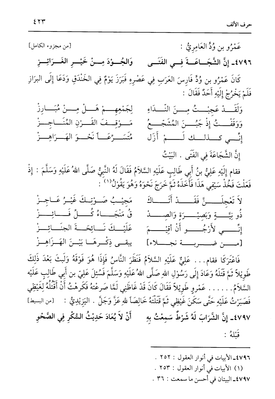 عَمْرُو بن وُدٍّ العَامِرِيُّ: [من مجزوء الكامل]
