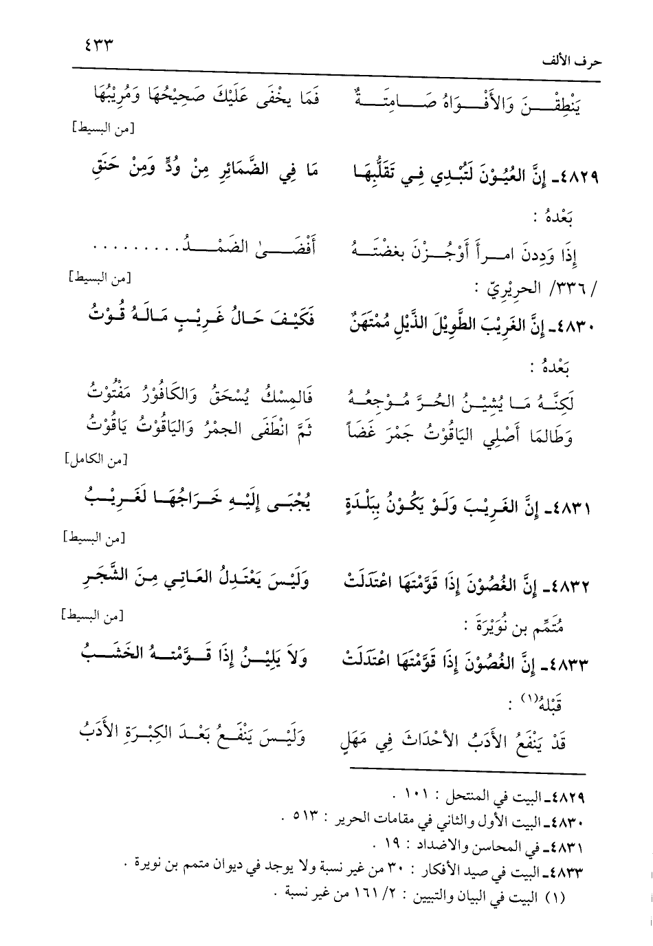 4833 - البيت في صيد الأفكار: 30 من غير نسبة ولا يوجد في ديوان متمم بن نويرة.