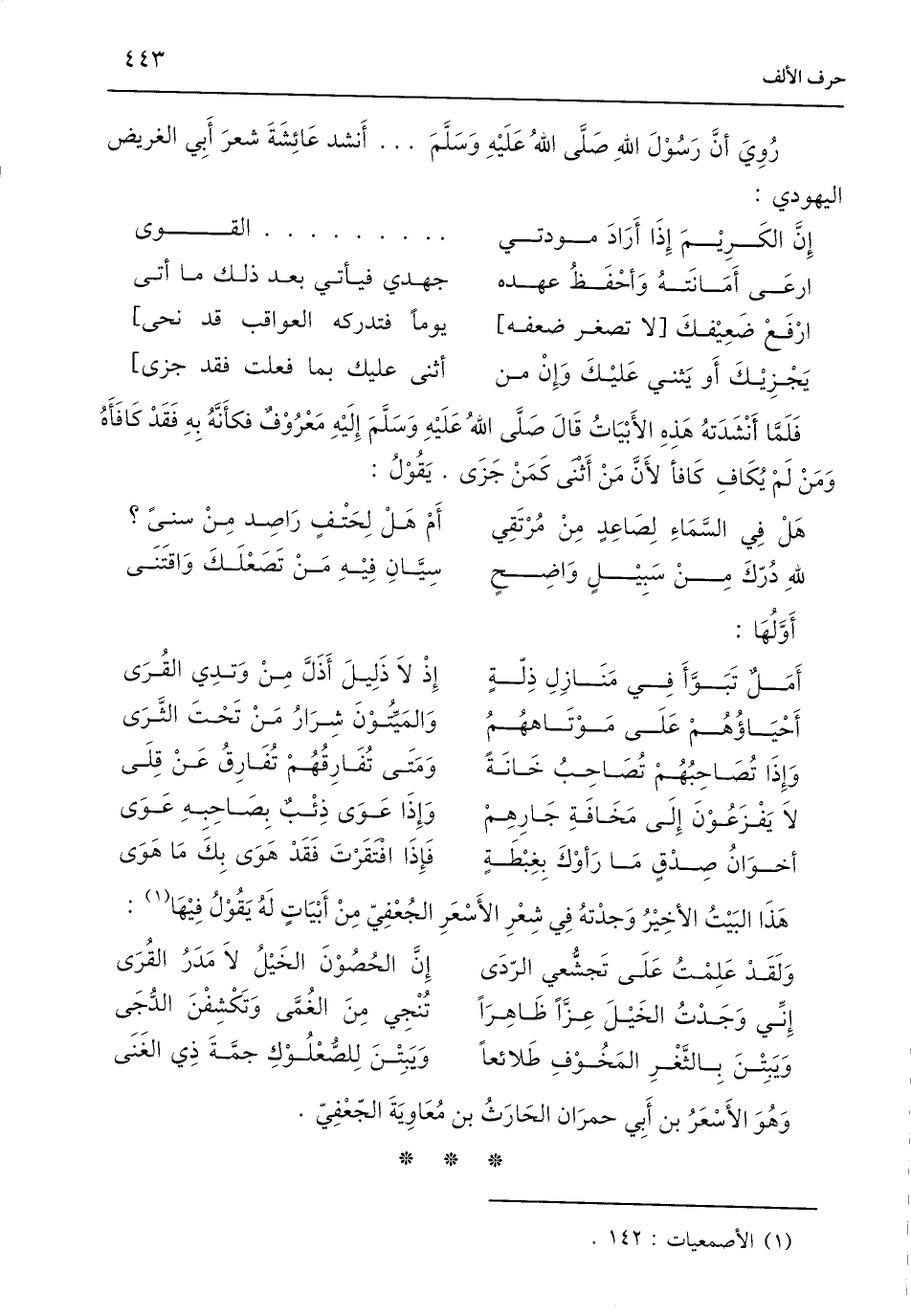 رُوِيَ أَنَّ رَسُوْلَ اللَّهِ صَلَّى اللَّهُ عَلَيْهِ وَسَلَّمَ. . . أَنشد عَائِشَةَ شعرَ أَبِي الغريض اليهودي: