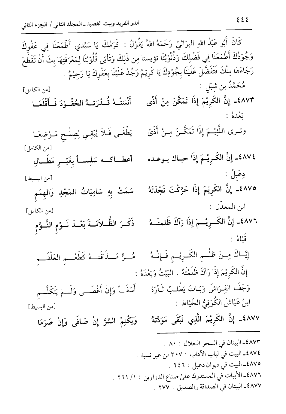 4877 - إِنَّ الكَرِيْمَ الَّذِي تَبْقَى مَوَدَّتهُ ... وَيَكْتِمُ السِّرَّ إِنْ صَافَى وَإِنْ صَرَمَا