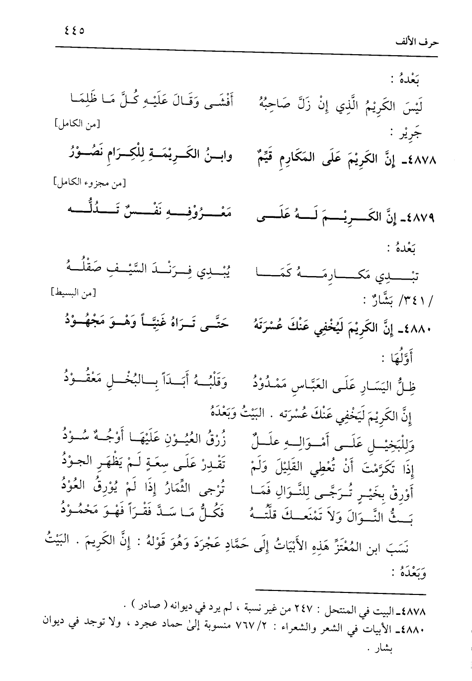 نَسَبَ ابن المُعْتَزِّ هَذِهِ الأَبْيَاتُ إِلَى حَمَّادِ عَجْرَدَ وَهُوَ قَوْلهُ: إِنَّ الكَرِيمَ. البَيْتُ وَبَعْدَهُ: