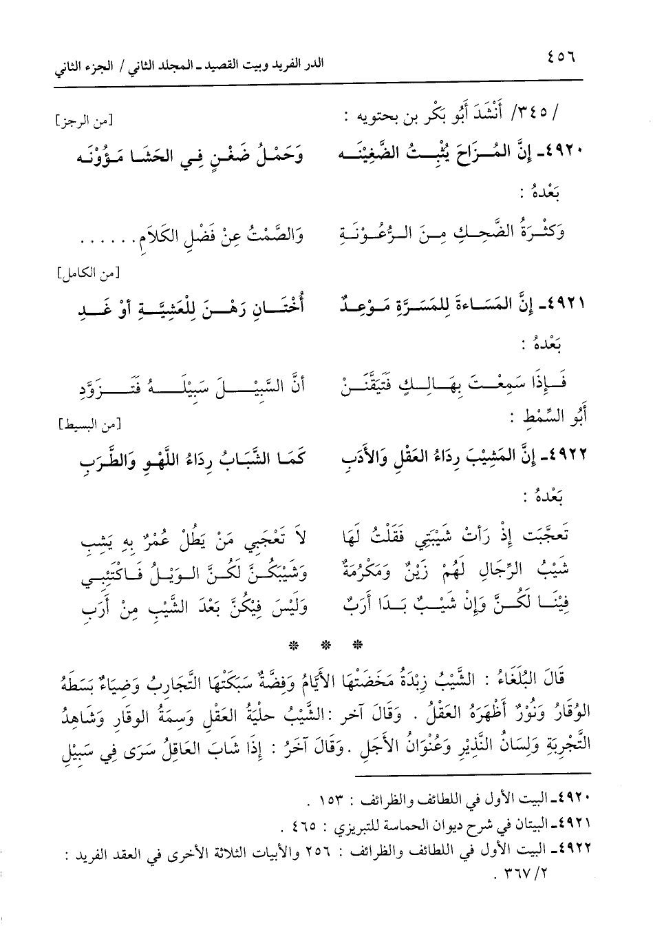 4922 - إِنَّ المَشِيْبَ رِدَاءُ العَقْلِ وَالأَدَبِ ... كَمَا الشَّبَابُ رِدَاءُ اللَّهْوِ وَالطَّرَبِ