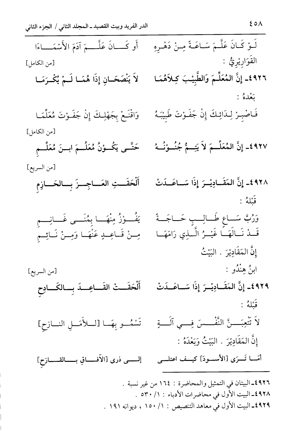 4927 - إِنَّ المُعَلِّمَ لَا يَتِمُّ جُنُوْنُهُ ... حَتَّى يَكُوْنُ مُعَلِّمَ ابنَ مُعَلِّمِ
