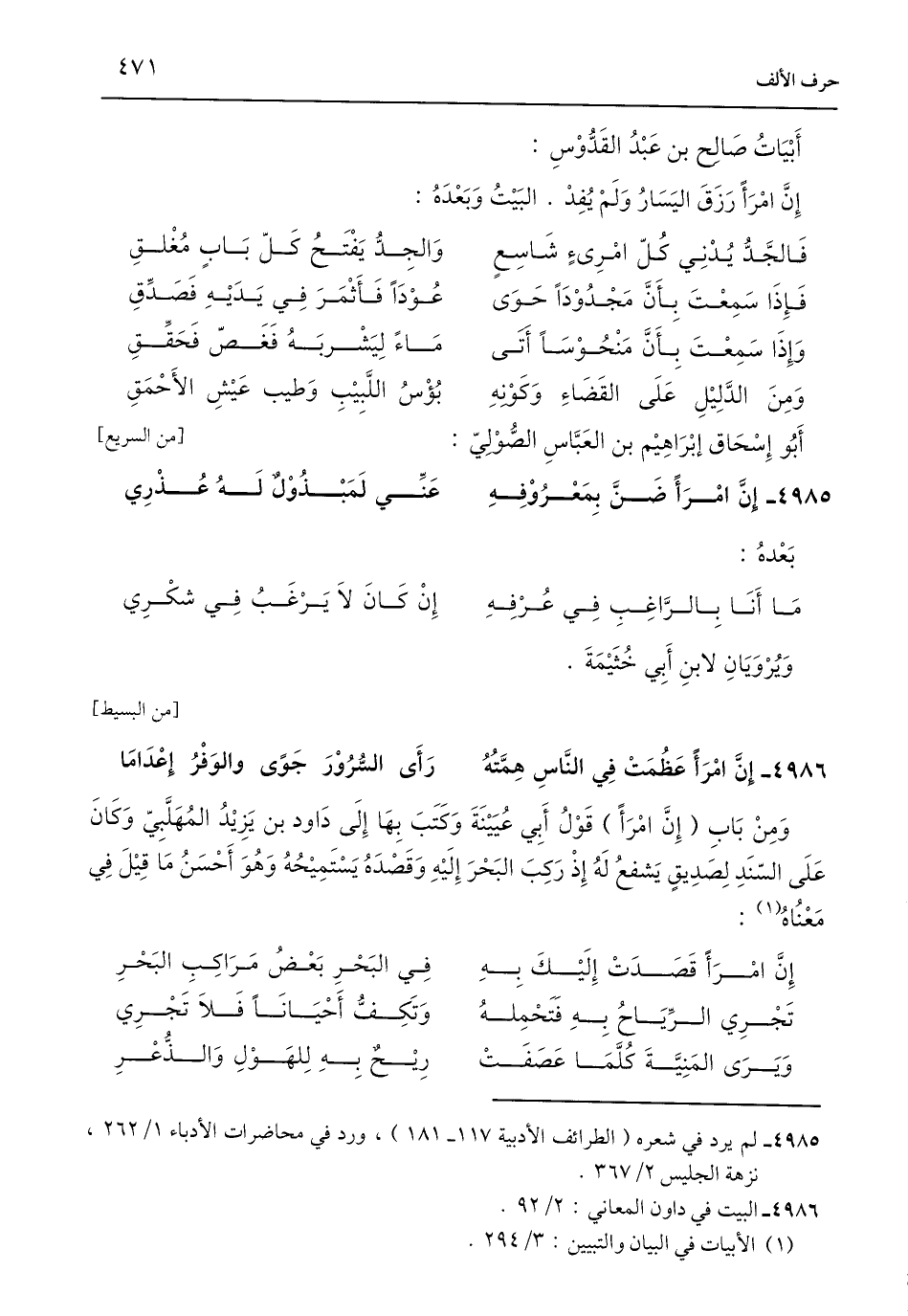 4985 - لم يرد في شعره (الطرائف الأدبية 117 - 181)، ورد في محاضرات الأدباء 1/ 262، نزهة الجليس 2/ 367.