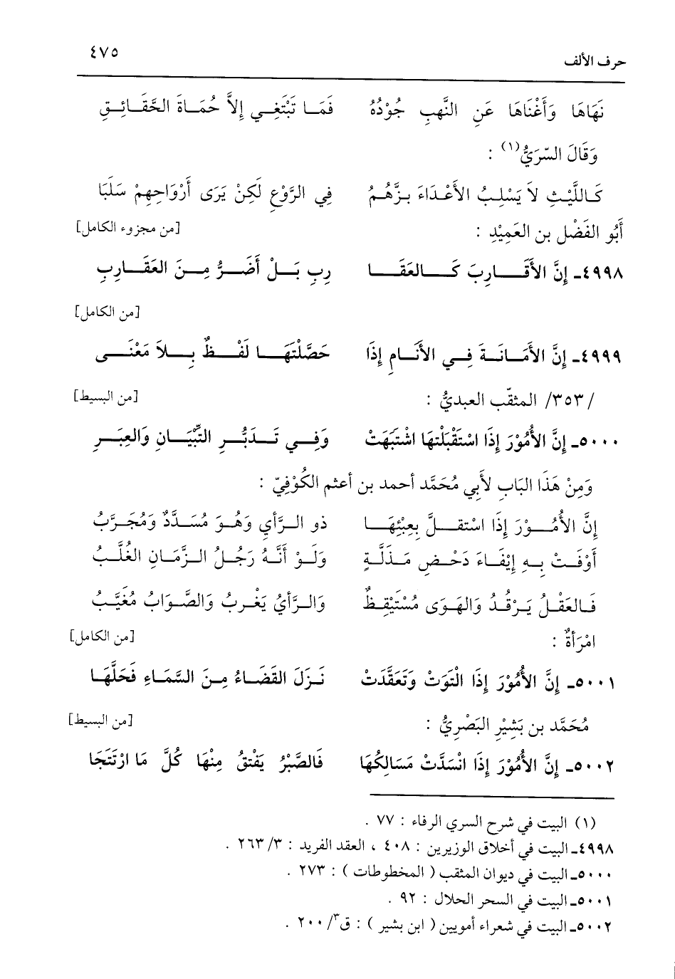 5002 - إِنَّ الأُمُوْرَ إِذَا انْسَدَّتْ مَسَالِكُهَا ... فَالصَّبْرُ يَفْتقُ منهما كُلَّ مَا ارْتَتَجَا