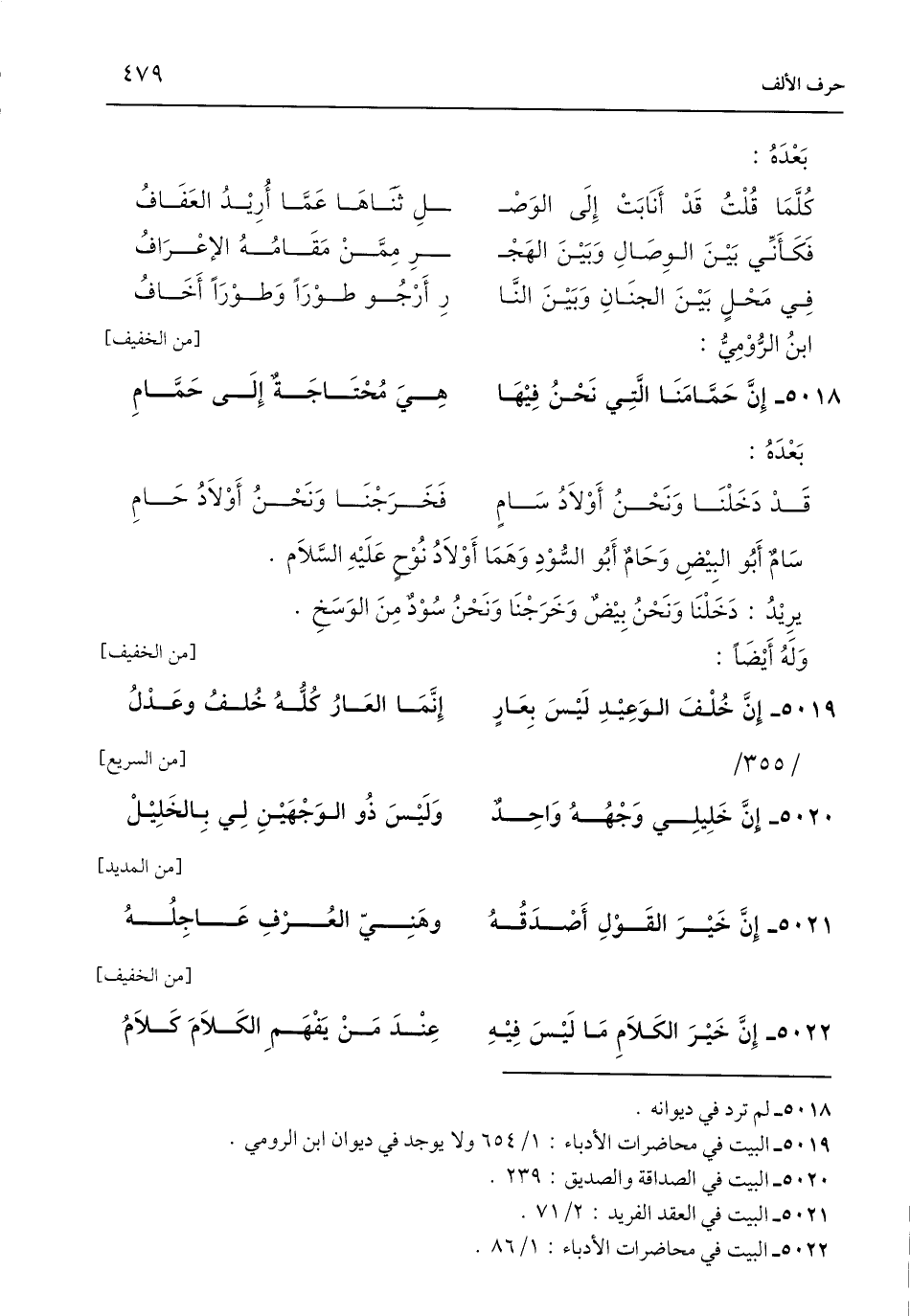 5019 - البيت في محاضرات الأدباء: 1/ 654 ولا يوجد في ديوان ابن الرومي.