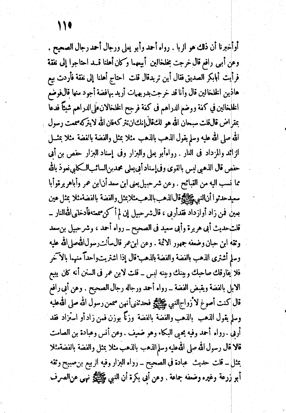6561 - «وَعَنْ أَبِي رَافِعٍ قَالَ: خَرَجْتُ بِخَلْخَالَيْنِ أَبِيعُهُمَا، وَكَانَ أَهْلُنَا قَدِ احْتَاجُوا إِلَى نَفَقَةٍ فَرَأَيْتُ أَبَا بَكْرٍ الصِّدِّيقَ، فَقَالَ: أَيْنَ تُرِيدُ؟ قَالَ: قُلْتُ: احْتَاجَ أَهْلُنَا إِلَى نَفَقَةٍ فَأَرَدْتُ بَيْعَ هَذَيْنِ الْخَلْخَالَيْنِ. قَالَ: وَأَنَا قَدْ خَرَجْتُ بِدُرَيْهِمَاتٍ أُرِيدَ بِهَا فِضَّةً أَجْوَدَ مِنْهَا. قَالَ: فَوَضَعَ الْخَلْخَالَيْنِ فِي كِفَّةٍ وَوَضَعَ الدَّرَاهِمَ فِي كِفَّةٍ، فَرَجَحَ الْخَلْخَالَانِ عَلَى الدَّرَاهِمِ شَيْئًا، فَدَعَا بِمِقْرَاضٍ. قَالَ: قُلْتُ: سُبْحَانَ اللَّهِ! هُوَ لَكَ. قَالَ: إِنَّكَ إِنْ تَتْرُكْهُ فَإِنَّ اللَّهَ لَا يَتْرُكُهُ؛ سَمِعْتُ رَسُولَ اللَّهِ - صَلَّى اللَّهُ عَلَيْهِ وَسَلَّمَ - يَقُولُ: " الذَّهَبُ بِالذَّهَبِ مِثْلًا بِمِثْلٍ، وَالْفِضَّةُ بِالْفِضَّةِ مِثْلًا بِمِثْلٍ، الزَّائِدُ وَالْمُزْدَادُ فِي النَّارِ».