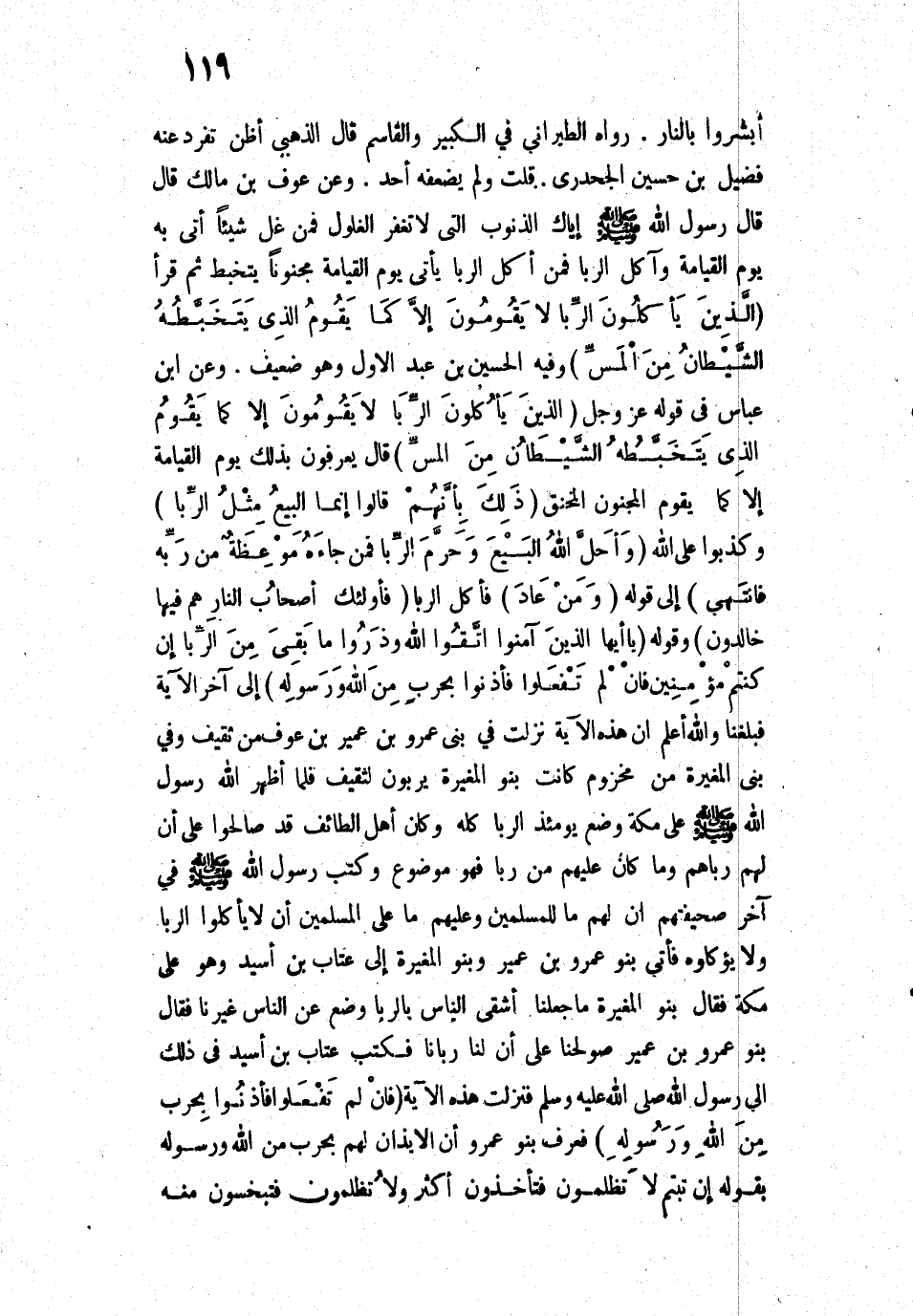 وَقَوْلِهِ: {يَا أَيُّهَا الَّذِينَ آمَنُوا اتَّقُوا اللَّهَ وَذَرُوا مَا بَقِيَ مِنَ الرِّبَا إِنْ كُنْتُمْ مُؤْمِنِينَ - فَإِنْ لَمْ تَفْعَلُوا فَأْذَنُوا بِحَرْبٍ مِنَ اللَّهِ وَرَسُولِهِ} [البقرة: 278 - 279] إِلَى آخَرِ الْآيَةِ فَبَلَغَنَا - وَاللَّهُ أَعْلَمُ - أَنَّ هَذِهِ الْآيَةَ نَزَلَتْ فِي بَنِي عَمْرِو بْنِ عُمَيْرِ بْنِ عَوْفٍ مِنْ ثَقِيفٍ، وَفِي بَنِي الْمُغِيرَةِ مِنْ مَخْزُومٍ؛ «كَانَتْ بَنُو الْمُغِيرَةِ يُرْبُونَ لِثَقِيفٍ فَلَمَّا أَظْهَرَ اللَّهُ رَسُولَ اللَّهِ - صَلَّى اللَّهُ عَلَيْهِ وَسَلَّمَ - عَلَى مَكَّةَ وَضَعَ يَوْمَئِذٍ الرِّبَا كُلَّهُ. وَكَانَ أَهْلُ الطَّائِفِ قَدْ صَالَحُوا عَلَى أَنَّ لَهُمْ رِبَاهُمْ وَمَا كَانَ عَلَيْهِمْ مِنْ رِبًا فَهُوَ مَوْضُوعٌ. وَكَتَبَ رَسُولُ اللَّهِ - صَلَّى اللَّهُ عَلَيْهِ وَسَلَّمَ - فِي آخِرِ صَحِيفَتِهِمْ: " أَنَّ لَهُمْ مَا لِلْمُسْلِمِينَ وَعَلَيْهِمْ مَا عَلَى الْمُسْلِمِينَ: أَنْ لَا يَأْكُلُوا الرِّبَا، وَلَا يُؤَاكِّلُوهُ ". فَأَتَى بَنُو عَمْرِو بْنِ عُمَيْرٍ، وَبَنُو الْمُغِيرَةِ إِلَى عَتَّابِ بْنِ أَسِيدٍ - وَهُوَ عَلَى مَكَّةَ - فَقَالَ بَنُو الْمُغِيرَةِ: مَا جَعَلَنَا أَشْقَى النَّاسِ بِالرِّبَا؟ وَضَعَ عَنِ النَّاسِ غَيْرَنَا. فَقَالَ بَنُو عَمْرِو بْنِ عُمَيْرٍ: صُولِحْنَا عَلَى أَنَّ لَنَا رِبَانَا. فَكَتَبَ عَتَّابُ بْنُ أَسِيدٍ فِي ذَلِكَ إِلَى رَسُولِ اللَّهِ - صَلَّى اللَّهُ عَلَيْهِ وَسَلَّمَ - فَنَزَلَتْ هَذِهِ الْآيَةُ: {فَإِنْ لَمْ تَفْعَلُوا فَأْذَنُوا بِحَرْبٍ مِنَ اللَّهِ وَرَسُولِهِ} [البقرة: 279] فَعَرَفَ بَنُو عَمْرٍو أَنَّ الْإِيذَانَ لَهُمْ بِحَرْبٍ مِنَ اللَّهِ وَرَسُولِهِ بِقَوْلِهِ: {إِنْ تُبْتُمْ فَلَكُمْ رُءُوسُ أَمْوَالِكُمْ لَا تَظْلِمُونَ} [البقرة: 279] فَتَأْخُذُونَ أَكْثَرَ {وَلَا تُظْلَمُونَ} [البقرة: 279] فَتُبْخَسُونَ مِنْهُ»