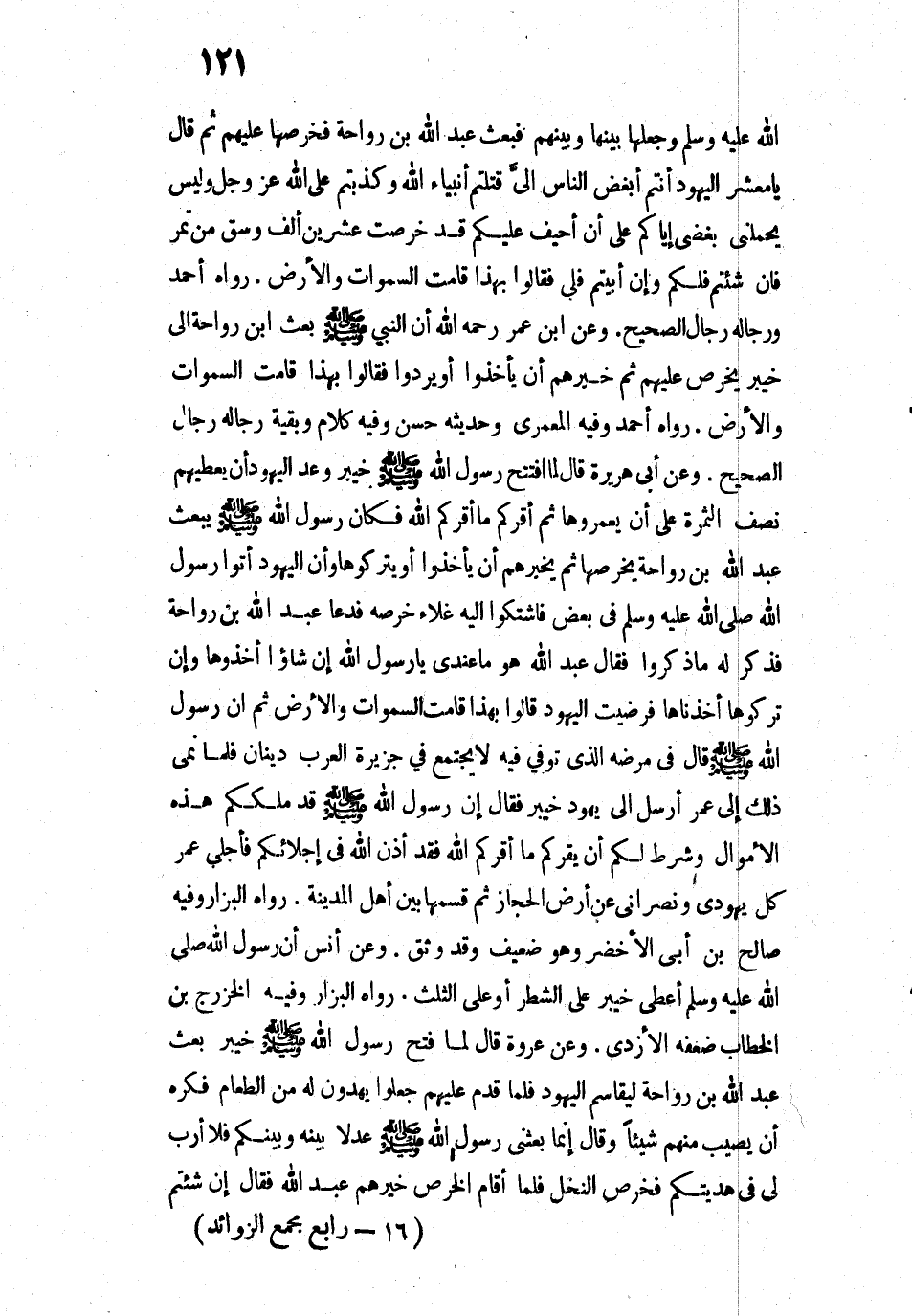 اللَّهُ عَلَيْهِ وَسَلَّمَ - وَجَعَلَهَا بَيْنَهَا وَبَيْنَهُمْ. فَبَعَثَ عَبْدَ اللَّهِ بْنَ رَوَاحَةَ فَخَرَصَهَا عَلَيْهِمْ، ثُمَّ قَالَ: يَا مَعْشَرَ الْيَهُودِ أَنْتُمْ أَبْغَضُ النَّاسِ إِلَيَّ؛ قَتَلْتُمْ أَنْبِيَاءَ اللَّهِ، وَكَذَبْتُمْ عَلَى اللَّهِ عَزَّ وَجَلَّ، وَلَيْسَ يَحْمِلُنِي بُغْضِي إِيَّاكُمْ عَلَى أَنْ أَحِيفَ عَلَيْكُمْ، قَدْ خَرَصْتُ عِشْرِينَ أَلْفَ وَسْقٍ مِنْ تَمْرٍ، فَإِنْ شِئْتُمْ فَلَكُمْ، وَإِنْ أَبَيْتُمْ فَلِي. فَقَالُوا: بِهَذَا قَامَتِ السَّمَاوَاتُ وَالْأَرْضُ».