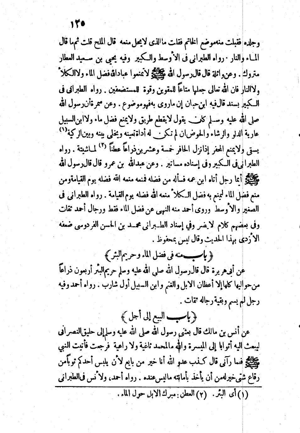 6616 - عَنْ أَبِي هُرَيْرَةَ قَالَ: «قَالَ رَسُولُ اللَّهِ - صَلَّى اللَّهُ عَلَيْهِ وَسَلَّمَ -: " حَرِيمُ الْبِئْرِ أَرْبَعُونَ ذِرَاعًا مِنْ حَوَالَيْهَا، كُلُّهَا لِأَعْطَانِ الْإِبِلِ، وَالْغَنَمِ، وَابْنُ السَّبِيلِ أَوَّلُ شَارِبٍ [وَلَا يُمْنَعْ فَضْلَ مَاءٍ لِيَمْنَعَ بِهِ الْكَلَأَ]» ".