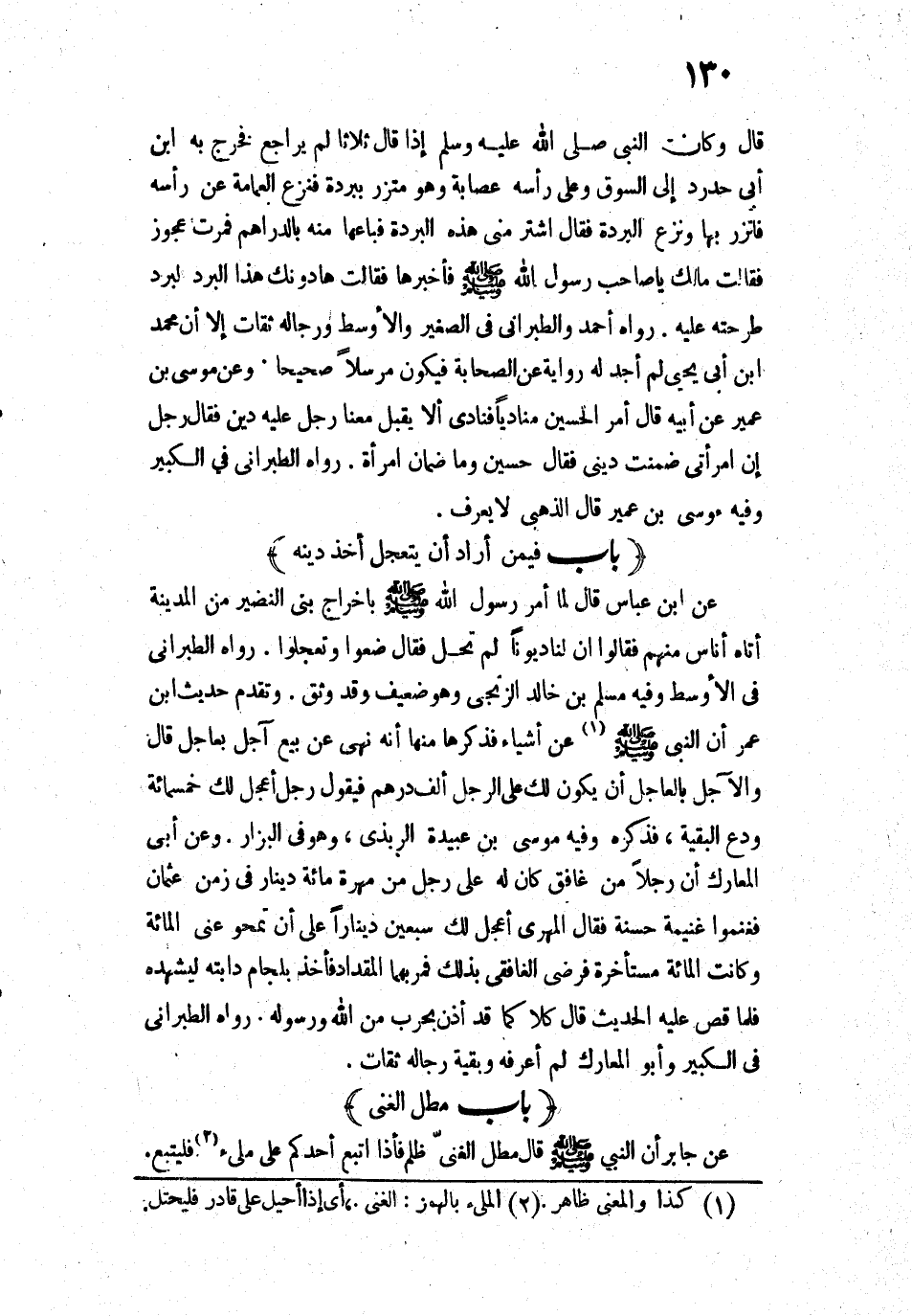 قَالَ: وَكَانَ النَّبِيُّ - صَلَّى اللَّهُ عَلَيْهِ وَسَلَّمَ - إِذَا قَالَ ثَلَاثًا لَمْ يُرَاجَعْ. فَخَرَجَ بِهِ ابْنُ أَبِي حَدْرَدٍ إِلَى السُّوقِ، وَعَلَى رَأْسِهِ عِصَابَةٌ، وَهُوَ مُتَّزِرٌ بِبُرْدَةٍ، فَنَزَعَ الْعِمَامَةَ عَنْ رَأْسِهِ فَاتَّزَرَ بِهَا، وَنَزَعَ الْبُرْدَةَ، فَقَالَ: اشْتَرِ مِنِّي هَذِهِ الْبُرْدَةَ، فَبَاعَهَا مِنْهُ بِالدَّرَاهِمِ، فَمَرَّتْ عَجُوزٌ، فَقَالَتْ: مَا لَكَ يَا صَاحِبَ رَسُولِ اللَّهِ - صَلَّى اللَّهُ عَلَيْهِ وَسَلَّمَ -؟ فَأَخْبَرَهَا. فَقَالَتْ: هَا دُونَكَ هَذَا الْبُرْدَ؛ لِبُرْدٍ طَرَحَتْهُ عَلَيْهِ».