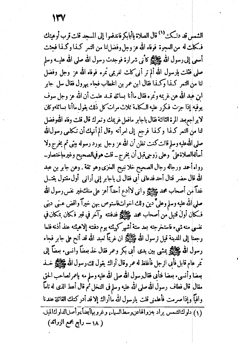 الشَّمْسُ قَدْ دَلَكَتْ قَالَ: " الصَّلَاةَ يَا أَبَا بَكْرٍ "، فَانْدَفَعُوا إِلَى الْمَسْجِدِ، قُلْتُ: قَرِّبْ أَوْعِيَتَكَ. فَكِلْتُ لَهُ مِنَ الْعَجْوَةِ، فَوَفَّاهُ اللَّهُ عَزَّ وَجَلَّ وَفَضَلَ لَنَا مِنَ التَّمْرِ كَذَا وَكَذَا، فَجِئْتُ أَسْعَى إِلَى رَسُولِ اللَّهِ - صَلَّى اللَّهُ عَلَيْهِ وَسَلَّمَ -[فِي مَسْجِدِهِ] كَأَنِّي شَرَارَةٌ، فَوَجَدْتُ رَسُولَ اللَّهِ - صَلَّى اللَّهُ عَلَيْهِ وَسَلَّمَ - فَقُلْتُ: يَا رَسُولَ اللَّهِ، أَلَمْ تَرَ أَنِّي كِلْتُ لِغَرِيمِي تَمْرَهُ، فَوَفَّاهُ اللَّهُ عَزَّ وَجَلَّ، وَفَضَلَ لَنَا مِنَ التَّمْرِ كَذَا وَكَذَا، فَقَالَ: أَيْنَ عُمَرُ بْنُ الْخَطَّابِ؟ ". فَجَاءَ يُهَرْوِلُ، فَقَالَ: " سَلْ جَابِرَ بْنَ عَبْدِ اللَّهِ عَنْ غَرِيمِهِ وَتَمْرِهِ ". فَقَالَ: مَا أَنَا بِسَائِلِهِ، قَدْ عَلِمْتُ أَنَّ اللَّهَ عَزَّ وَجَلَّ سَوْفَ يُوَفِّيهِ إِذْ أَخْبَرْتَ [أَنَّ اللَّهَ عَزَّ وَجَلَّ سَوْفَ يُوَفِّيهِ]، فَكَرَّرَ عَلَيْهِ الْكَلِمَةَ ثَلَاثَ مَرَّاتٍ كُلُّ ذَلِكَ يَقُولُ: مَا أَنَا بِسَائِلِهِ. وَكَانَ لَا يُرَاجَعُ بَعْدَ الْمَرَّةِ الثَّالِثَةِ. فَقَالَ: " يَا جَابِرُ، مَا فَعَلَ غَرِيمُكَ وَتَمْرُكَ؟ ". قَالَ: قُلْتُ: وَفَّاهُ اللَّهُ وَفَضَلَ لَنَا مِنَ التَّمْرِ كَذَا وَكَذَا. فَرَجَعَ إِلَى امْرَأَتِهِ، وَقَالَ: أَلَمْ أَنْهَكِ أَنْ تُكَلِّمِي رَسُولَ اللَّهِ - صَلَّى اللَّهُ عَلَيْهِ وَسَلَّمَ - قَالَتْ: كُنْتَ تَظُنُّ أَنَّ اللَّهَ عَزَّ وَجَلَّ يُورِدُ رَسُولَهُ بَيْتِي، ثُمَّ يَخْرُجُ، وَلَا أَسْأَلُهُ الصَّلَاةَ عَلَيَّ، وَعَلَى زَوْجِي قَبْلَ أَنْ يَخْرُجَ»؟.