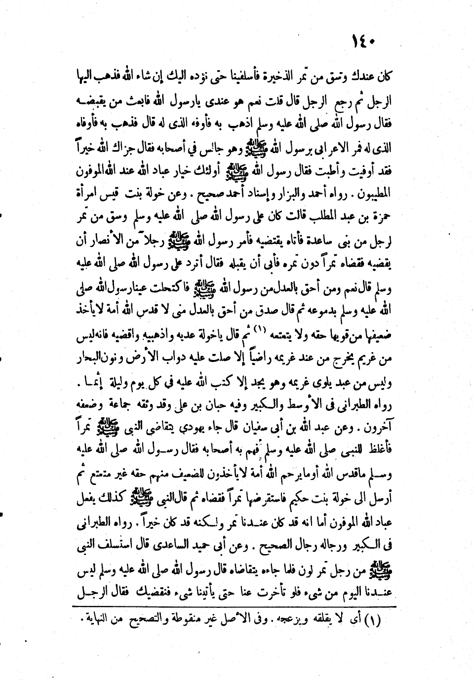 كَانَ عِنْدَكِ وَسْقٌ مِنْ تَمْرِ الذَّخِيرَةِ فَأَسْلِفِينَا حَتَّى نُؤَدِّيهِ إِلَيْكِ إِنْ شَاءَ اللَّهُ ". فَذَهَبَ إِلَيْهَا الرَّجُلُ، ثُمَّ رَجَعَ الرَّجُلُ قَالَ: قَالَتْ: نَعَمْ هُوَ عِنْدِي يَا رَسُولَ اللَّهِ فَابْعَثْ إِلَيَّ مَنْ يَقْبِضُهُ. فَقَالَ رَسُولُ اللَّهِ - صَلَّى اللَّهُ عَلَيْهِ وَسَلَّمَ -: " اذْهَبْ بِهِ فَأَوْفِهِ الَّذِي لَهُ ". قَالَ: فَذَهَبَ بِهِ فَأَوْفَاهُ الَّذِي لَهُ، فَمَرَّ الْأَعْرَابِيُّ بِرَسُولِ اللَّهِ - صَلَّى اللَّهُ عَلَيْهِ وَسَلَّمَ -، وَهُوَ جَالِسٌ فِي أَصْحَابِهِ فَقَالَ: جَزَاكَ اللَّهُ خَيْرًا، فَقَدْ أَوْفَيْتَ وَأَطَبْتَ. فَقَالَ رَسُولُ اللَّهِ - صَلَّى اللَّهُ عَلَيْهِ وَسَلَّمَ -: " أُولَئِكَ خِيَارُ عِبَادِ اللَّهِ [يَوْمَ الْقِيَامَةِ] عِنْدَ اللَّهِ الْمُوفُونَ الْمُطَيِّبُونَ» ".
