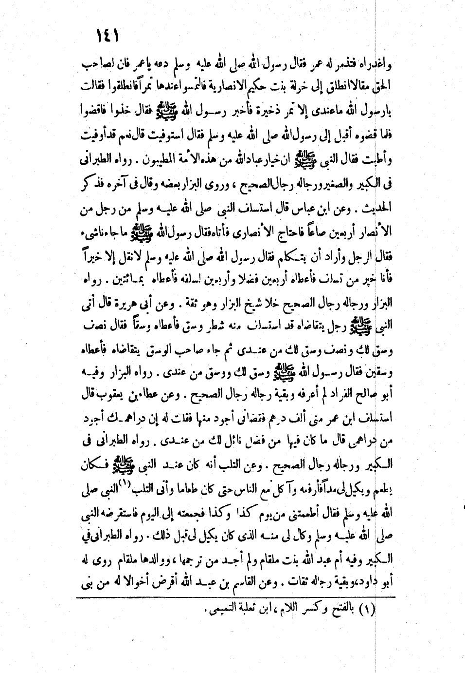 «وَأَتَى التَّلِبُّ النَّبِيَّ - صَلَّى اللَّهُ عَلَيْهِ وَسَلَّمَ - فَقَالَ: أَطْعَمْتَنِي مِنْ يَوْمِ كَذَا وَكَذَا فَجَمَعْتُهُ إِلَى الْيَوْمِ فَاسْتَقْرَضَهُ مِنِّي النَّبِيُّ - صَلَّى اللَّهُ عَلَيْهِ وَسَلَّمَ - وَكَالَ لِي مِنْهُ الَّذِي كَانَ يَكِيلُ لِي قَبْلَ ذَلِكَ».