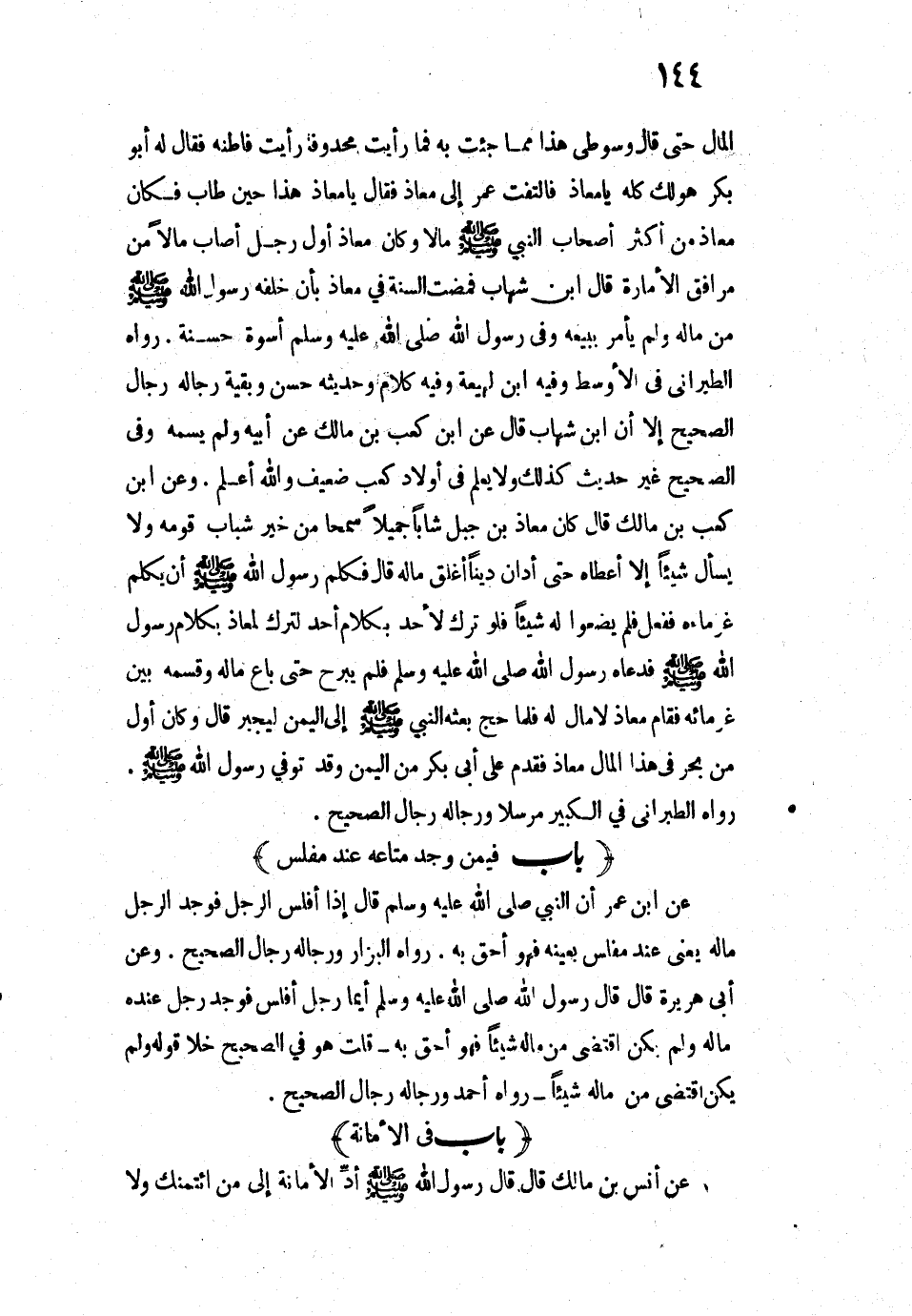 الْمَالِ حَتَّى قَالَ: وَسَوْطِي هَذَا مِمَّا جِئْتُ بِهِ فَمَا رَأَيْتُ مَخْذُومًا رَأَيْتُ فَأَطِبْهُ؟ فَقَالَ لَهُ أَبُو بَكْرٍ: هُوَ لَكَ كُلُّهُ يَا مُعَاذُ، فَالْتَفَتَ عُمَرُ إِلَى مُعَاذٍ، فَقَالَ: يَا مُعَاذُ، هَذَا حِينَ طَابَ، فَكَانَ مُعَاذٌ مِنْ أَكْثَرِ أَصْحَابِ النَّبِيِّ - صَلَّى اللَّهُ عَلَيْهِ وَسَلَّمَ - مَالًا، وَكَانَ مُعَاذٌ أَوَّلَ رَجُلٍ أَصَابَ مَالًا مِنْ مَرَافِقِ الْإِمَارَةِ».