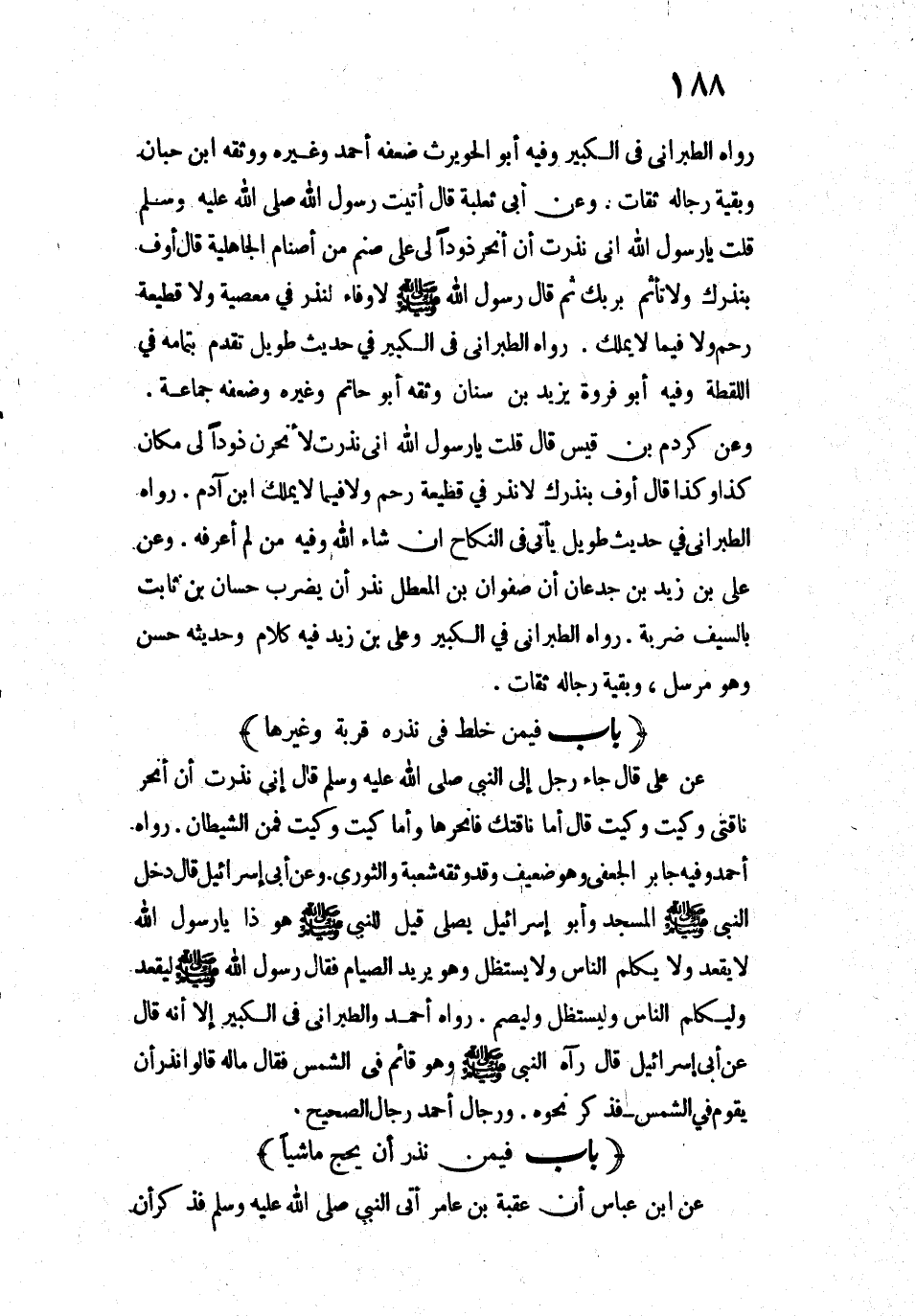 6963 - «وَعَنْ كَرَدْمِ بْنِ قَيْسٍ قَالَ: قُلْتُ: يَا رَسُولَ اللَّهِ إِنِّي نَذَرْتُ لَأَنْحَرَنَّ ذُودًا لِي مَكَانَ كَذَا وَكَذَا، قَالَ: " أَوْفِ بِنَذْرِكَ لَا نَذْرَ فِي قَطِيعَةِ رَحِمٍ، وَلَا فِيمَا لَا يَمْلِكُ ابْنُ آدَمَ» ".