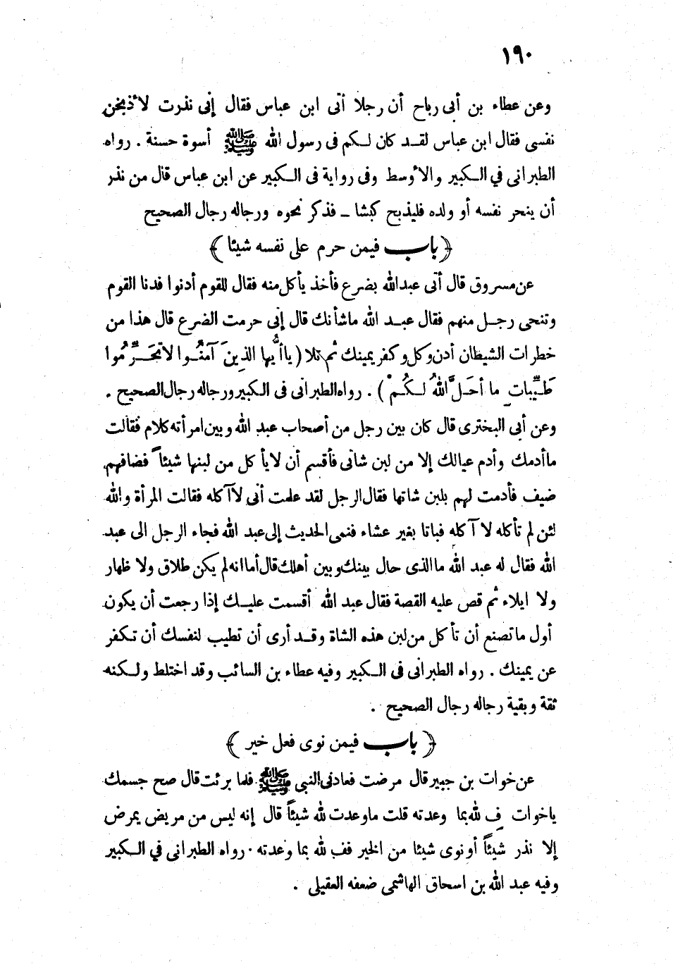 6973 - وَفِي رِوَايَةٍ فِي الْكَبِيرِ عَنِ ابْنِ عَبَّاسٍ قَالَ: مَنْ نَذَرَ أَنْ يَنْحَرَ نَفْسَهُ أَوْ وَلَدَهُ فَلْيَذْبَحْ كَبْشًا. فَذَكَرَ نَحْوَهُ. وَرِجَالُهُ رِجَالُ الصَّحِيحِ.