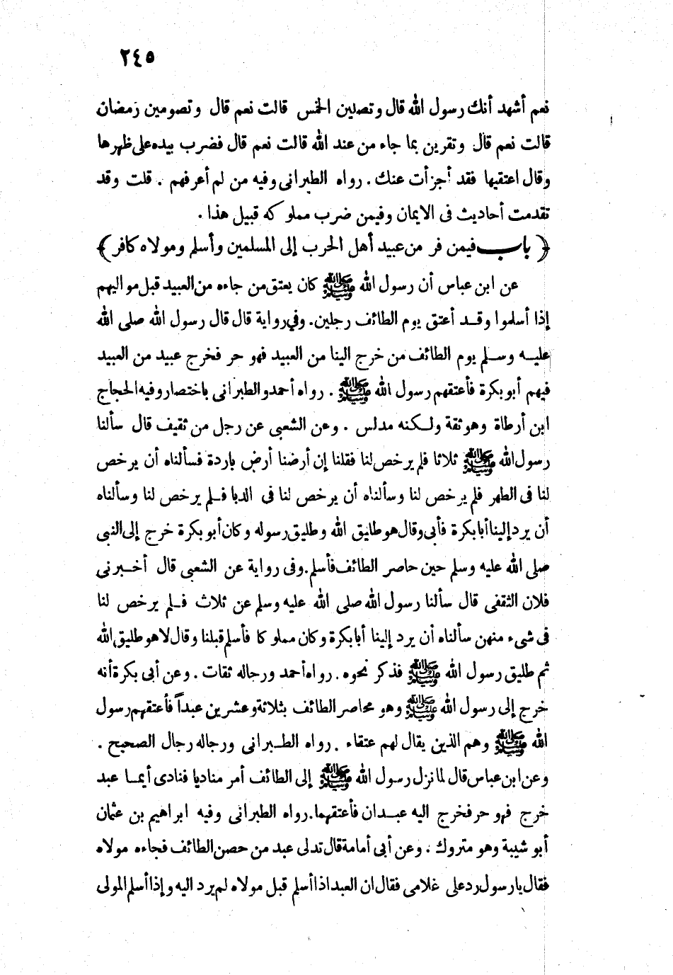7266 - عَنِ ابْنِ عَبَّاسٍ «أَنَّ رَسُولَ اللَّهِ - صَلَّى اللَّهُ عَلَيْهِ وَسَلَّمَ - كَانَ يُعْتِقُ مَنْ جَاءَهُ مِنَ الْعَبِيدِ قَبْلَ مَوَالِيهِمْ إِذَا أَسْلَمُوا. وَقَدْ أَعْتَقَ يَوْمَ الطَّائِفِ رَجُلَيْنِ».