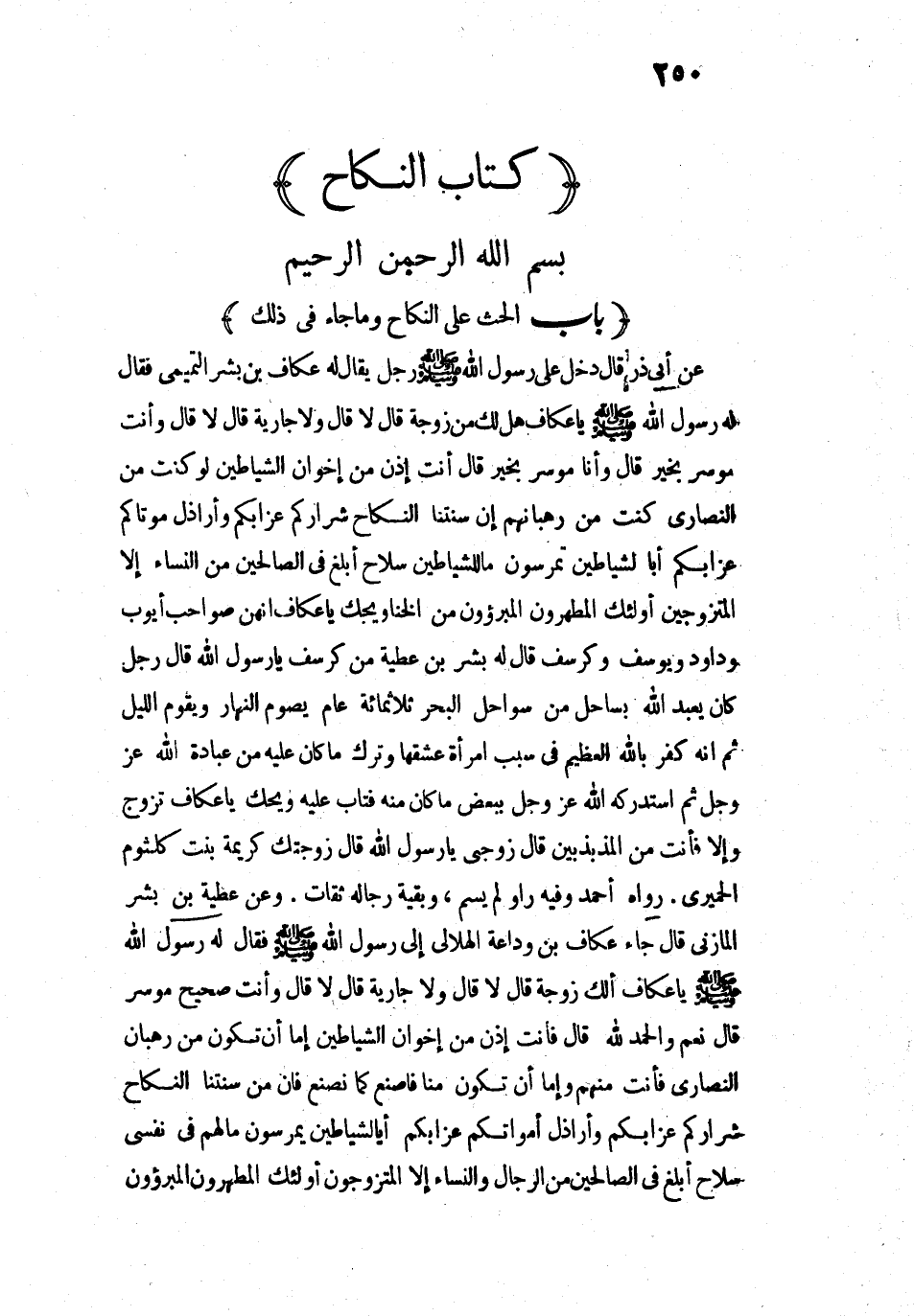 «7297 عَنْ أَبِي ذَرٍّ قَالَ: دَخَلَ عَلَى رَسُولِ اللَّهِ - صَلَّى اللَّهُ عَلَيْهِ وَسَلَّمَ - رَجُلٌ يُقَالُ لَهُ: عَكَّافُ بْنُ بِشْرٍ التَّمِيمِيُّ فَقَالَ لَهُ رَسُولُ اللَّهِ - صَلَّى اللَّهُ عَلَيْهِ وَسَلَّمَ -: " يَا عَكَّافُ هَلْ لَكَ مِنْ زَوْجَةٍ؟ " قَالَ: لَا. قَالَ: " وَلَا جَارِيَةٍ؟ " قَالَ: لَا. قَالَ: " وَأَنْتَ مُوسِرٌ بِخَيْرٍ؟ " قَالَ: وَأَنَا مُوسِرٌ بِخَيْرٍ. قَالَ: " أَنْتَ إِذَنْ مِنْ إِخْوَانِ الشَّيَاطِينِ، لَوْ كُنْتَ مِنَ النَّصَارَى كُنْتَ مِنْ رُهْبَانِهِمْ، إِنَّ سُنَّتَنَا النِّكَاحُ، شِرَارُكُمْ عُزَّابُكُمْ، وَأَرَاذِلُ مَوْتَاكُمْ عُزَّابُكُمْ، أَبِالشَّيَاطِينِ تَمْرُسُونَ؟ مَا لِلشَّيَاطِينِ سِلَاحٌ أَبْلَغُ فِي الصَّالِحِينَ مِنَ النِّسَاءِ إِلَّا الْمُتَزَوِّجُونَ أُولَئِكَ الْمُطَهَّرُونَ الْمُبَرَّءُونَ مِنَ الْخَنَا. وَيْحَكَ يَا عَكَّافُ إِنَّهُنَّ صَوَاحِبُ أَيُّوبَ وَدَاوُدَ وَيُوسُفَ وَكُرْسُفَ ". قَالَ لَهُ بِشْرُ بْنُ عَطِيَّةَ: مَنْ كُرْسُفُ يَا رَسُولَ اللَّهِ؟ قَالَ: " رَجُلٌ كَانَ يَعْبُدُ اللَّهَ بِسَاحِلٍ مِنْ سَوَاحِلِ الْبَحْرِ ثَلَاثَمِائَةِ عَامٍ؛ يَصُومُ النَّهَارَ وَيَقُومُ اللَّيْلَ، ثُمَّ إِنَّهُ كَفَرَ بِاللَّهِ الْعَظِيمِ فِي سَبَبِ امْرَأَةٍ عَشِقَهَا وَتَرَكَ مَا كَانَ عَلَيْهِ مِنْ عِبَادَةِ اللَّهِ عَزَّ وَجَلَّ، ثُمَّ اسْتَدْرَكَهُ اللَّهُ عَزَّ وَجَلَّ بِبَعْضِ مَا كَانَ مِنْهُ فَتَابَ عَلَيْهِ. وَيْحَكَ يَا عَكَّافُ تَزَوَّجْ، وَإِلَّا فَأَنْتَ مِنَ الْمُذَبْذَبِينَ ". قَالَ: زَوِّجْنِي يَا رَسُولَ اللَّهِ. قَالَ: " زَوَّجْتُكَ كَرِيمَةَ بِنْتَ كُلْثُومٍ الْحِمْيَرِيِّ» ".