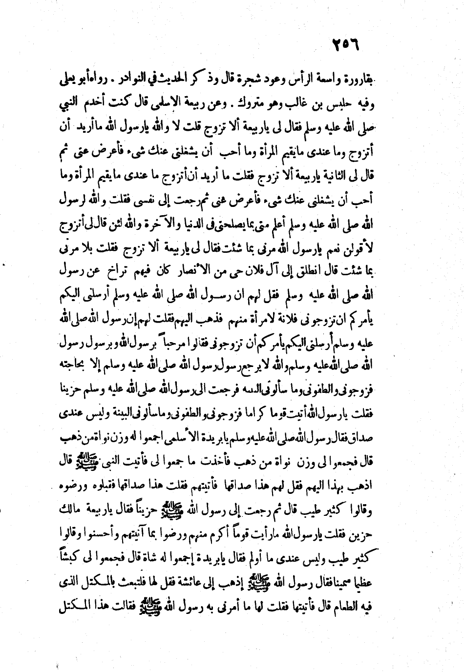 7334 - «وَعَنْ رَبِيعَةَ الْأَسْلَمِيِّ قَالَ: كُنْتُ أَخْدِمُ النَّبِيَّ - صَلَّى اللَّهُ عَلَيْهِ وَسَلَّمَ - فَقَالَ لِي: " يَا رَبِيعَةُ أَلَا تَزَوَّجُ؟ ". قُلْتُ: لَا وَاللَّهِ يَا رَسُولَ اللَّهِ مَا أُرِيدُ أَنْ أَتَزَوَّجَ وَمَا عِنْدِي مَا يُقِيمُ الْمَرْأَةَ وَمَا أُحِبُّ أَنْ يَشْغَلَنِي عَنْكَ شَيْءٌ. فَأَعْرَضَ عَنِّي [فَخَدَمْتُهُ مَا خَدَمْتُهُ]، ثُمَّ قَالَ لِي الثَّانِيَةَ: " يَا رَبِيعَةُ أَلَا تَزَوَّجُ؟ ". فَقُلْتُ: مَا أُرِيدُ أَنْ أَتَزَوَّجَ مَا عِنْدِي مَا يُقِيمُ الْمَرْأَةَ وَمَا أُحِبُّ أَنْ يَشْغَلَنِي عَنْكَ شَيْءٌ. فَأَعْرَضَ عَنِّي، ثُمَّ رَجَعْتُ إِلَى نَفْسِي فَقُلْتُ: وَاللَّهِ لَرَسُولُ اللَّهِ - صَلَّى اللَّهُ عَلَيْهِ وَسَلَّمَ - أَعْلَمُ مِنِّي بِمَا يُصْلِحُنِي فِي الدُّنْيَا وَالْآخِرَةِ وَاللَّهِ لَئِنْ قَالَ لِي أَتَزَوَّجُ لَأَقُولَنَّ نَعَمْ يَا رَسُولَ اللَّهِ مُرْنِي بِمَا شِئْتَ. فَقَالَ لِي: " يَا رَبِيعَةُ أَلَا تَزَوَّجُ؟ ". فَقُلْتُ: بَلَى مُرْنِي بِمَا شِئْتَ. قَالَ: " انْطَلِقْ إِلَى آلِ فُلَانٍ - حَيٍّ مِنَ الْأَنْصَارِ كَانَ فِيهِمْ تَرَاخٍ عَنْ رَسُولِ اللَّهِ - صَلَّى اللَّهُ عَلَيْهِ وَسَلَّمَ - فَقُلْ لَهُمْ: إِنَّ رَسُولَ اللَّهِ - صَلَّى اللَّهُ عَلَيْهِ وَسَلَّمَ - أَرْسَلَنِي إِلَيْكُمْ يَأْمُرُكُمْ أَنْ تُزَوِّجُونِي فُلَانَةً " - لِامْرَأَةٍ مِنْهُمْ - فَذَهَبْتُ إِلَيْهِمْ، فَقُلْتُ لَهُمْ: إِنَّ رَسُولَ اللَّهِ - صَلَّى اللَّهُ عَلَيْهِ وَسَلَّمَ - أَرْسَلَنِي إِلَيْكُمْ يَأْمُرُكُمْ أَنْ تُزَوِّجُونِي فُلَانَةً. فَقَالُوا: مَرْحَبًا بِرَسُولِ اللَّهِ وَبِرَسُولِ رَسُولِ اللَّهِ - صَلَّى اللَّهُ عَلَيْهِ وَسَلَّمَ - وَاللَّهِ لَا يَرْجِعُ رَسُولُ رَسُولِ اللَّهِ - صَلَّى اللَّهُ عَلَيْهِ وَسَلَّمَ - إِلَّا بِحَاجَتِهِ. فَزَوَّجُونِي وَأَلْطَفُونِي وَمَا سَأَلُونِي الْبَيِّنَةَ، وَلَيْسَ عِنْدِي صَدَاقٌ. فَقَالَ رَسُولُ اللَّهِ - صَلَّى اللَّهُ عَلَيْهِ وَسَلَّمَ -: " يَا بُرَيْدَةُ الْأَسْلَمِيُّ اجْمَعُوا لَهُ وَزْنَ نَوَاةٍ مِنْ ذَهَبٍ " قَالَ: فَجَمَعُوا لِي وَزْنَ نَوَاةٍ مِنْ ذَهَبٍ فَأَخَذْتُ مَا جَمَعُوا لِي فَأَتَيْتُ [بِهِ] النَّبِيَّ - صَلَّى اللَّهُ عَلَيْهِ وَسَلَّمَ - قَالَ: " اذْهَبْ بِهَذَا إِلَيْهِمْ فَقُلْ لَهُمْ: هَذَا صَدَاقُهَا ". فَأَتَيْتُهُمْ فَقُلْتُ: هَذَا صَدَاقُهَا. فَقَبِلُوهُ وَرَضُوهُ وَقَالُوا: كَثِيرٌ طَيِّبٌ. قَالَ: ثُمَّ رَجَعْتُ إِلَى رَسُولِ اللَّهِ - صَلَّى اللَّهُ عَلَيْهِ وَسَلَّمَ - حَزِينًا فَقَالَ: " يَا رَبِيعَةُ مَا لَكَ حَزِينٌ؟ " فَقُلْتُ: يَا رَسُولَ اللَّهِ مَا رَأَيْتُ قَوْمًا أَكْرَمَ مِنْهُمْ وَرَضُوا بِمَا آتَيْتُهُمْ وَأَحَسَنُوا وَقَالُوا: كَثِيرٌ طَيِّبٌ وَلَيْسَ عِنْدِي مَا أُولِمُ. فَقَالَ: " يَا بُرَيْدَةُ اجْمَعُوا لَهُ شَاةً " قَالَ: فَجَمَعُوا لِي كَبْشًا عَظِيمًا سَمِينًا، فَقَالَ لِي رَسُولُ اللَّهِ - صَلَّى اللَّهُ عَلَيْهِ وَسَلَّمَ -: " اذْهَبْ إِلَى عَائِشَةَ فَقُلْ لَهَا فَلْتَبْعَثْ بِالْمِكْتَلِ الَّذِي فِيهِ الطَّعَامُ " قَالَ: فَأَتَيْتُهَا، فَقُلْتُ لَهَا مَا أَمَرَنِي بِهِ رَسُولُ اللَّهِ - صَلَّى اللَّهُ عَلَيْهِ وَسَلَّمَ - فَقَالَتْ: هَذَا الْمِكْتَلُ