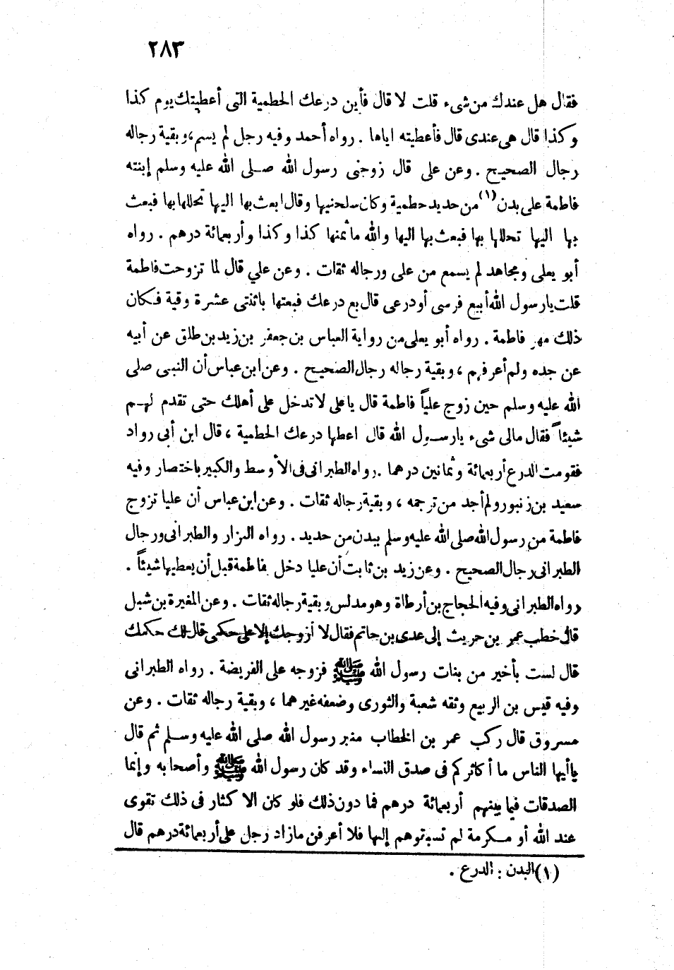 7499 - «وَعَنِ ابْنِ عَبَّاسٍ أَنَّ عَلِيًّا تَزَوَّجَ فَاطِمَةَ مِنْ رَسُولِ اللَّهِ - صَلَّى اللَّهُ عَلَيْهِ وَسَلَّمَ - بِبَدَنٍ مِنْ حَدِيدٍ».