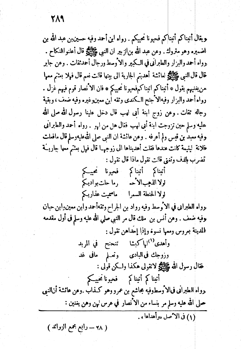 فَقَالَ رَسُولُ اللَّهِ - صَلَّى اللَّهُ عَلَيْهِ وَسَلَّمَ -: " لَا تَقُولِي هَكَذَا، وَلَكِنْ قُولِي: أَتَيْنَاكُمْ أَتَيْنَاكُمْ فَحَيُّونَا نُحَيِّيكُمْ» ".