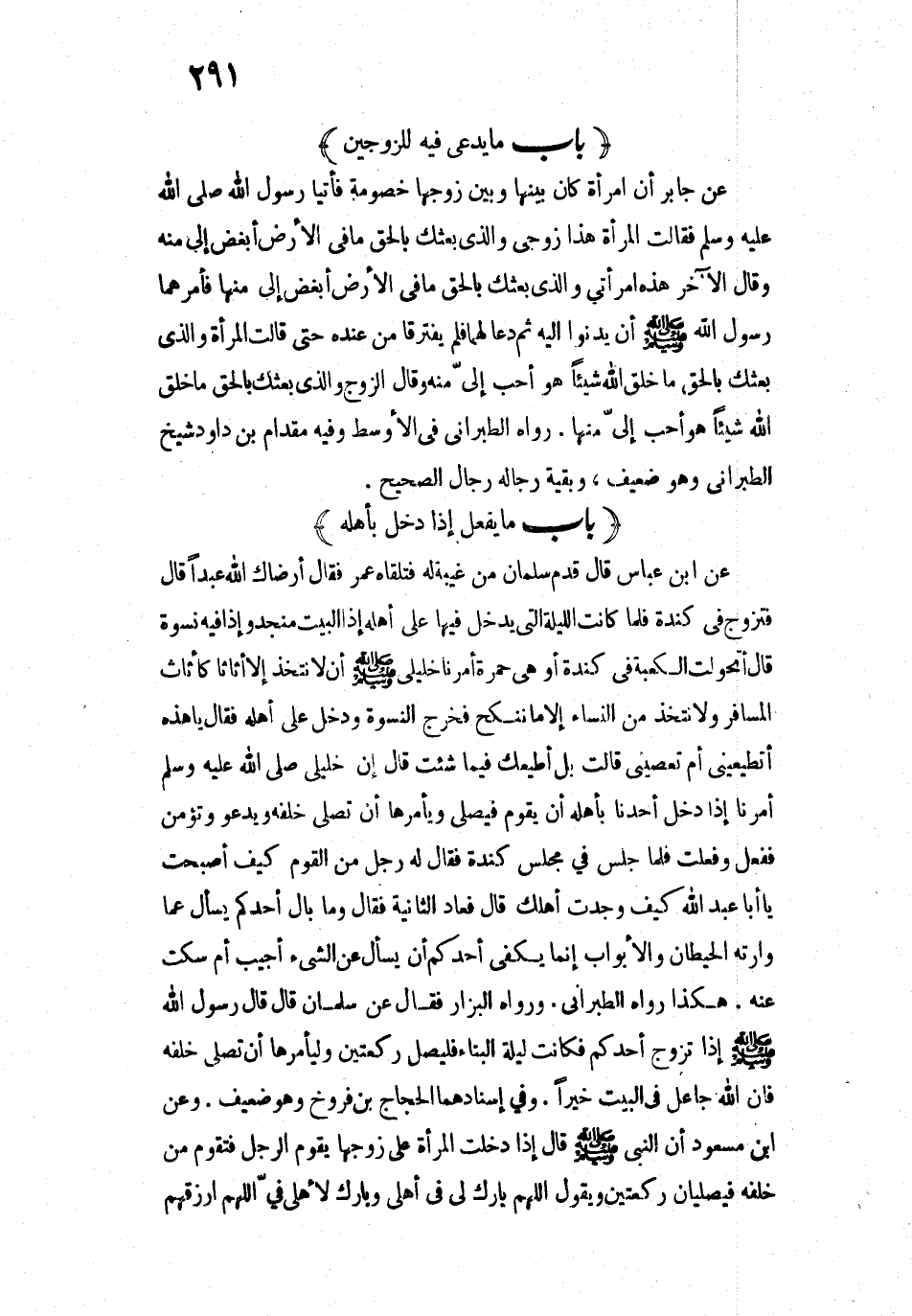 7543 - «عَنْ جَابِرٍ أَنَّ امْرَأَةً كَانَ بَيْنَهَا وَبَيْنَ زَوْجِهَا خُصُومَةٌ فَأَتَيَا رَسُولَ اللَّهِ - صَلَّى اللَّهُ عَلَيْهِ وَسَلَّمَ - فَقَالَتِ الْمَرْأَةُ: هَذَا زَوْجِي وَالَّذِي بَعَثَكَ بِالْحَقِّ مَا فِي الْأَرْضِ أَبْغَضُ إِلَيَّ مِنْهُ. وَقَالَ الْآخَرُ: هَذِهِ امْرَأَتِي وَالَّذِي بَعَثَكَ بِالْحَقِّ مَا فِي الْأَرْضِ أَبْغَضُ إِلَيَّ مِنْهَا. فَأَمَرَهُمَا رَسُولُ اللَّهِ - صَلَّى اللَّهُ عَلَيْهِ وَسَلَّمَ - أَنْ يَدْنُوَا إِلَيْهِ، ثُمَّ دَعَا لَهُمَا فَلَمْ يَفْتَرِقَا مِنْ عِنْدِهِ حَتَّى قَالَتِ الْمَرْأَةُ: وَالَّذِي بَعَثَكَ بِالْحَقِّ مَا خَلَقَ اللَّهُ شَيْئًا هُوَ أَحَبُّ إِلَيَّ مِنْهُ. وَقَالَ الزَّوْجُ: وَالَّذِي بَعَثَكَ بِالْحَقِّ مَا خَلَقَ اللَّهُ شَيْئًا هُوَ أَحَبُّ إِلَيَّ مِنْهَا».