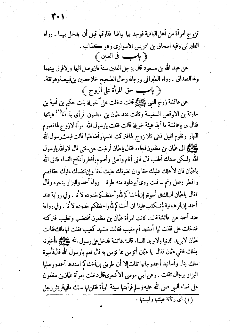 7610 - «عَنْ عَائِشَةَ زَوْجِ النَّبِيِّ - صَلَّى اللَّهُ عَلَيْهِ وَسَلَّمَ - قَالَتْ: دَخَلْتُ عَلَى خُوَيْلَةَ بِنْتِ حَكِيمِ بْنِ أُمَيَّةَ بْنِ حَارِثَةَ بْنِ الْأَوْقَصِ السُّلَمِيَّةِ، وَكَانَتْ عِنْدَ عُثْمَانَ بْنِ مَظْعُونٍ: فَرَأَى بَذَاذَةَ هَيْئَتِهَا فَقَالَ لِي: " يَا عَائِشَةُ مَا أَبَذَّ هَيْئَةِ خُوَيْلَةَ " قَالَتْ: فَقُلْتُ: يَا رَسُولَ اللَّهِ امْرَأَةٌ لَا زَوْجَ لَهَا تَصُومُ النَّهَارَ وَتَقُومُ اللَّيْلَ فَهِيَ كَمَنْ لَا زَوْجَ لَهَا فَتَرَكَتْ نَفْسَهَا وَأَضَاعَتْهَا. قَالَتْ: فَبَعَثَ رَسُولُ اللَّهِ - صَلَّى اللَّهُ عَلَيْهِ وَسَلَّمَ - إِلَى عُثْمَانَ بْنِ مَظْعُونٍ فَجَاءَهُ فَقَالَ: " يَا عُثْمَانُ أَرَغِبْتَ عَنْ سُنَّتِي؟ " قَالَ: لَا وَاللَّهِ يَا رَسُولَ اللَّهِ، وَلَكِنْ سُنَّتَكَ أَطْلُبُ! قَالَ: " فَإِنِّي أَنَامُ وَأُصَلِّي وَأَصُومُ وَأُفْطِرُ، وَأَنْكِحُ النِّسَاءَ فَاتَّقِ اللَّهَ يَا عُثْمَانُ، فَإِنَّ لِأَهْلِكَ عَلَيْكَ حَقًّا، وَإِنَّ لِضَيْفِكَ عَلَيْكَ حَقًّا، وَإِنَّ لِنَفْسِكَ عَلَيْكَ حَقًّا فَصُمْ وَأَفْطِرْ وَصَلِّ وَنَمْ».