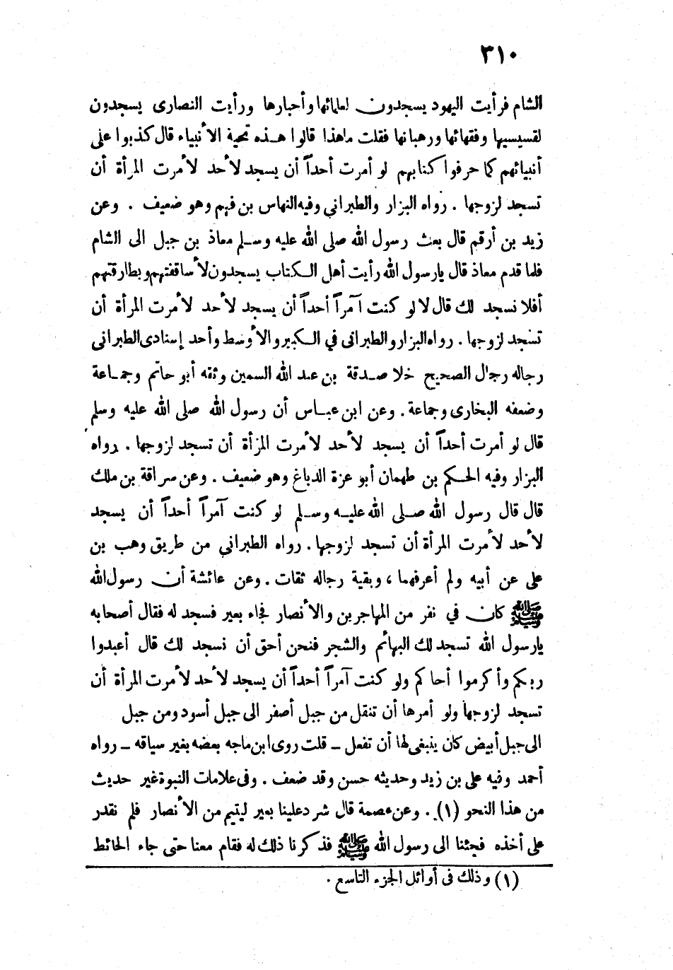 الشَّامَ فَرَأَيْتُ الْيَهُودَ يَسْجُدُونَ لِعُلَمَائِهَا وَأَحْبَارِهَا وَرَأَيْتُ النَّصَارَى يَسْجُدُونَ لِقِسِّيسِيهَا وَفُقَهَائِهَا وَرُهْبَانِهَا فَقُلْتُ: مَا هَذَا؟ قَالُوا: هَذِهِ تَحِيَّةُ الْأَنْبِيَاءِ. قَالَ: " كَذَبُوا عَلَى أَنْبِيَائِهِمْ كَمَا حَرَّفُوا كِتَابَهُمْ لَوْ أَمَرْتُ أَحَدًا أَنْ يَسْجُدَ لِأَحَدٍ لَأَمَرْتُ الْمَرْأَةَ أَنْ تَسْجُدَ لِزَوْجِهَا "».
