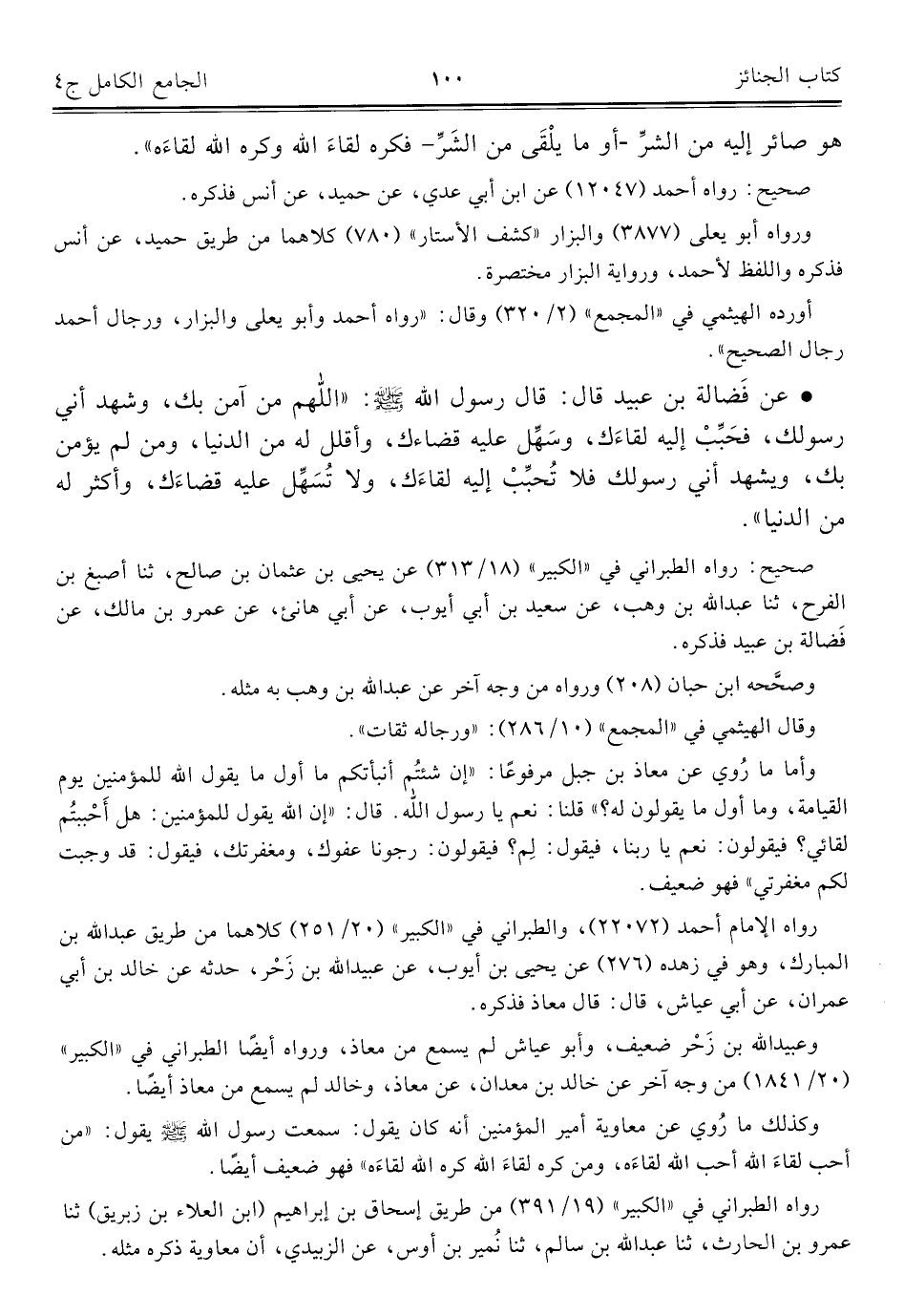 وكذلك ما رُوي عن معاوية أمير المؤمنين أنه كان يقول: سمعت رسول الله - صلى الله عليه وسلم - يقول: "من أحب لقاءَ الله أحب الله لقاءَه، ومن كره لقاءَ الله كره الله لقاءَه" فهو ضعيف أيضًا.