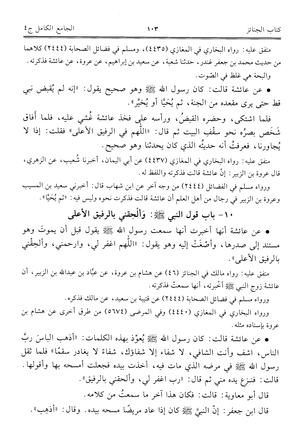 ١٠ - باب قول النبي - صلى الله عليه وسلم -: وَألْحِقني بالرفيق الأعلى