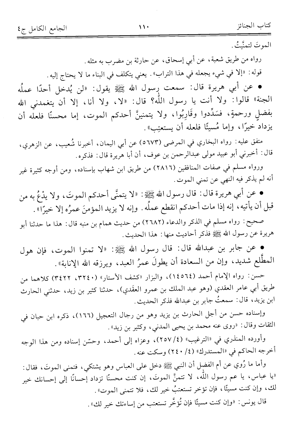 • عن أبي هريرة قال: قال رسول الله - صلى الله عليه وسلم -: "لا يتمنَّى أحدكم الموتَ، ولا يدْعُ به من قبل أن يأتيه، إنه إذا مات أحدكم انقطع عملُه. وإنه لا يزيد المؤمنَ عمرُه إلا خيرًا".