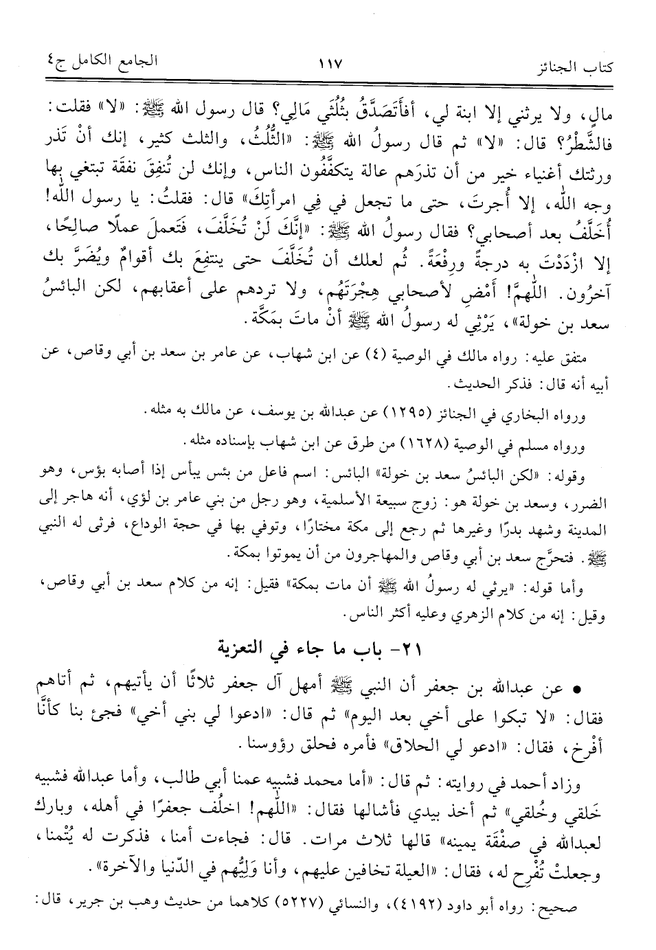 متفق عليه: رواه مالك في الوصية (٤) عن ابن شهاب، عن عامر بن سعد بن أبي وقاص، عن أبيه أنَّه قال: فذكر الحديث.