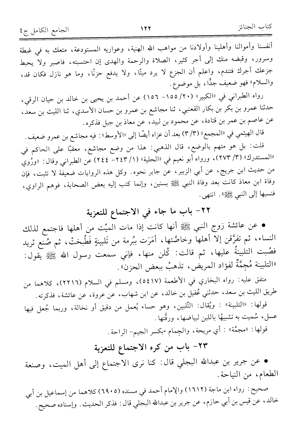• عن جرير بن عبد الله البجلي قال: كنا نرى الاجتماع إلى أهل الميت، وصنعة الطعام، من النياحة.