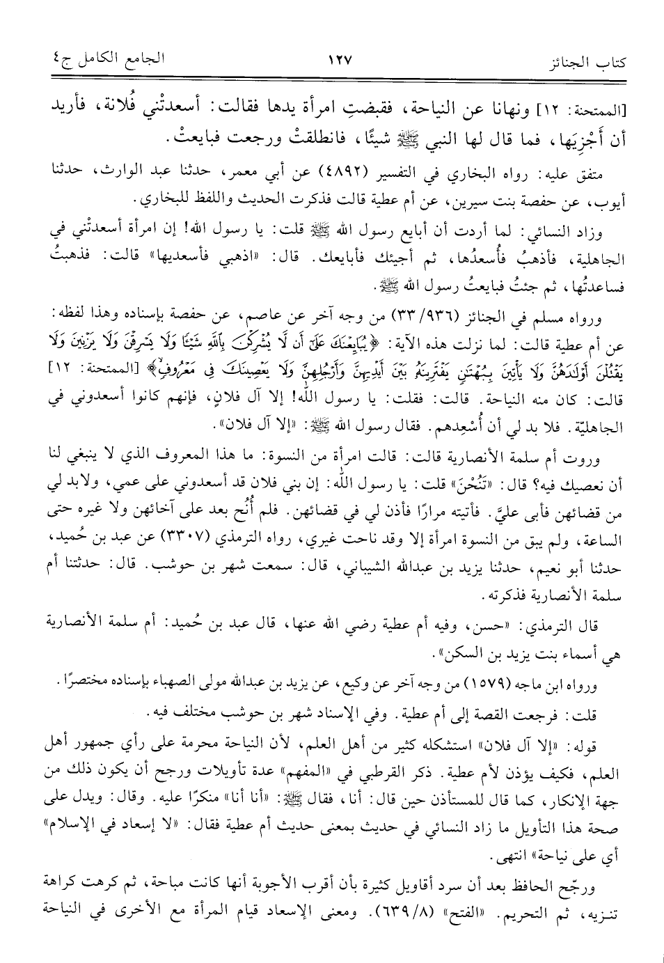 ورجّح الحافظ بعد أن سرد أقاويل كثيرة بأن أقرب الأجوبة أنها كانت مباحة، ثم كرهت كراهة تنزيه، ثم التحريم. "الفتح" (٨/ ٦٣٩). ومعنى الإسعاد قيام المرأة مع الأخرى في النياحة