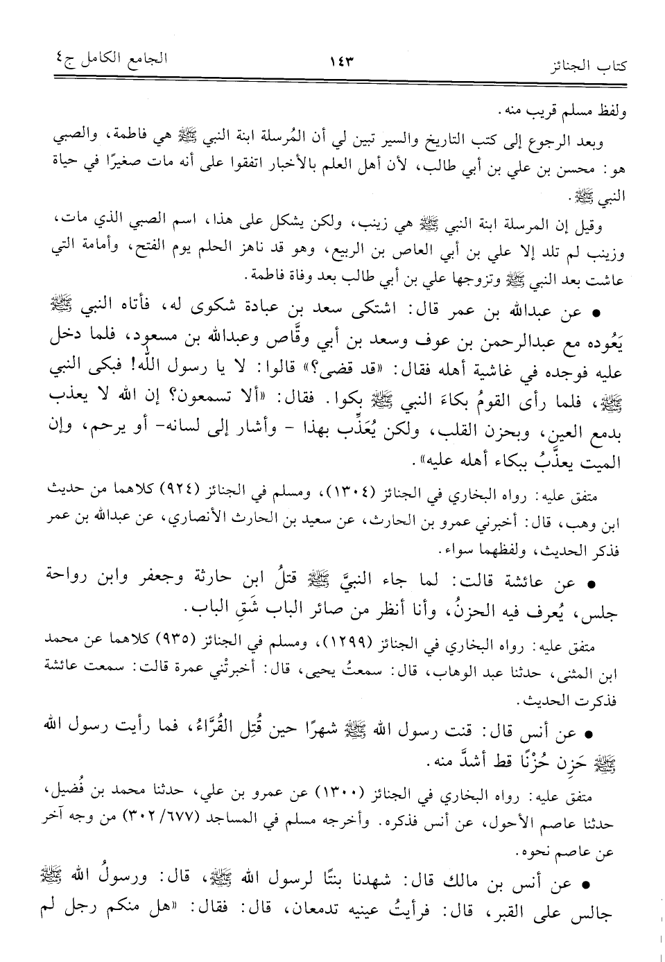 • عن أنس بن مالك قال: شهدنا بنتًا لرسول الله - صلى الله عليه وسلم -، قال: ورسولُ الله صلى الله عليه وسلم جالس على القبر، قال: فرأيتُ عينيه تدمعان، قال: فقال: "هل منكم رجل لم