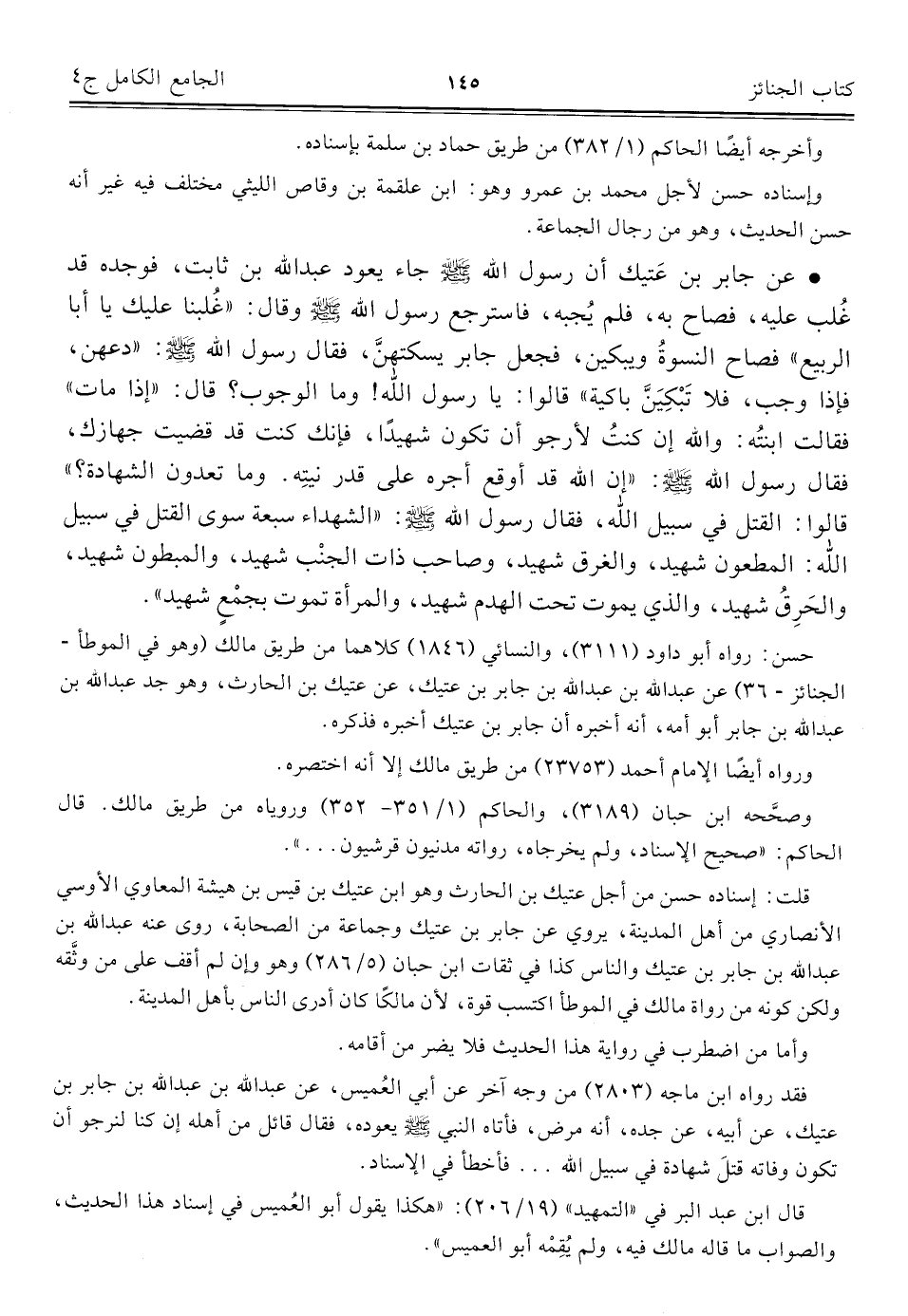 • عن جابر بن عَتيك أن رسول الله - صلى الله عليه وسلم - جاء يعود عبد الله بن ثابت، فوجده قد غُلب عليه، فصاح به، فلم يُجبه، فاسترجع رسول الله - صلى الله عليه وسلم - وقال: "غُلبنا عليك يا أبا الربيع" فصاح النسوةُ ويبكين، فجعل جابر يسكتهنَّ، فقال رسول الله - صلى الله عليه وسلم -: "دعهن، فإذا وجب، فلا تَبْكِيَنَّ باكية" قالوا: يا رسول الله! وما الوجوب؟ قال: "إذا مات" فقالت ابنتُه: والله إن كنتُ لأرجو أن تكون شهيدًا، فإنك كنت قد قضيت جهازك، فقال رسول الله - صلى الله عليه وسلم -: "إن الله قد أوقع أجره على قدر نيِته. وما تعدون الشهادة؟ " قالوا: القتل في سبيل الله، فقال رسول الله - صلى الله عليه وسلم -: "الشهداء سبعة سوى القتل في سبيل الله: المطعون شهيد، والغرق شهيد، وصاحب ذات الجنْب شهيد، والمبطون شهيد، والحَرِقُ شهيد، والذي يموت تحت الهدم شهيد، والمرأة تموت بجمْعٍ شهيد".